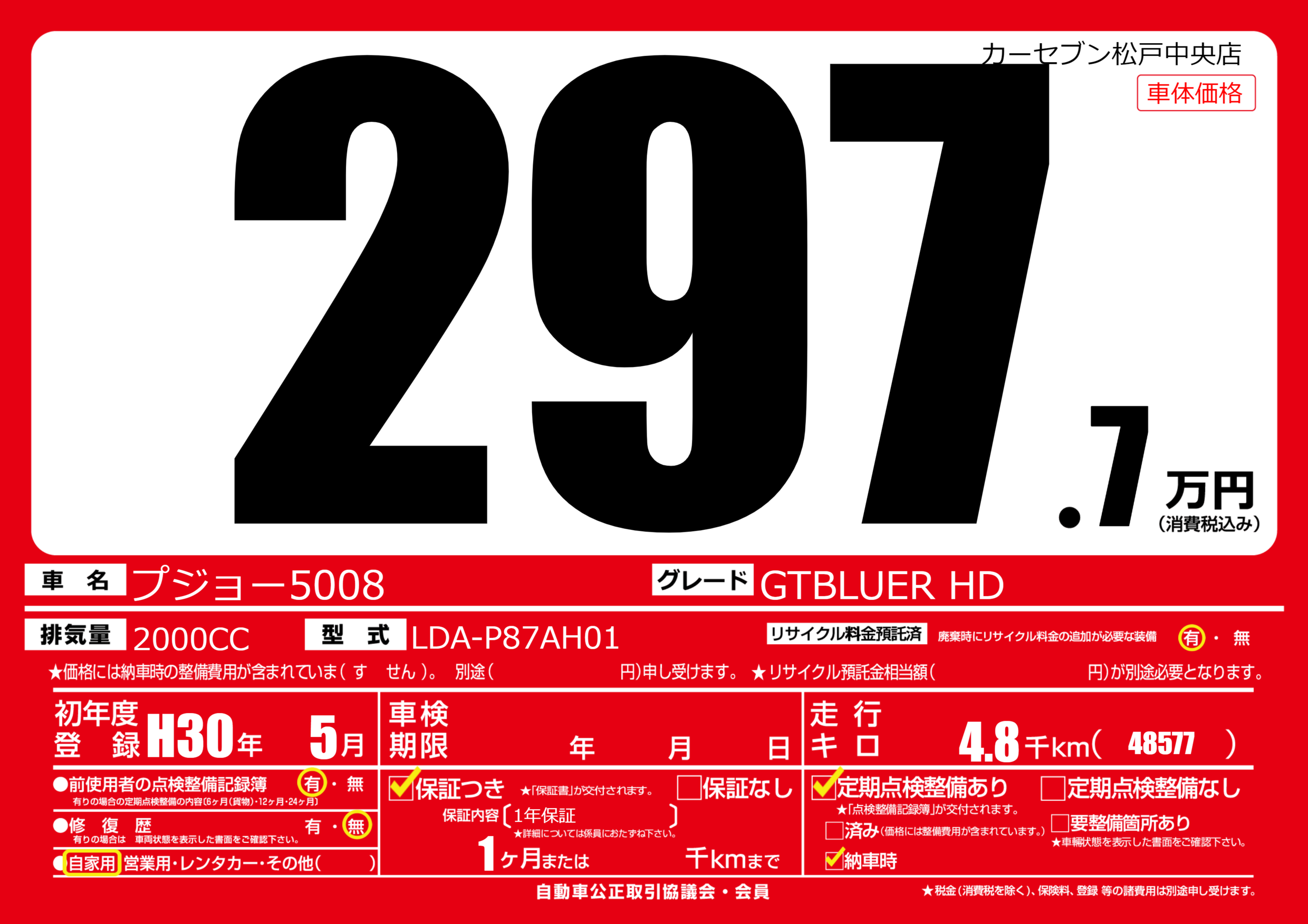 | 車名 | プジョー5008 | グレード ミッション 排気量 |
