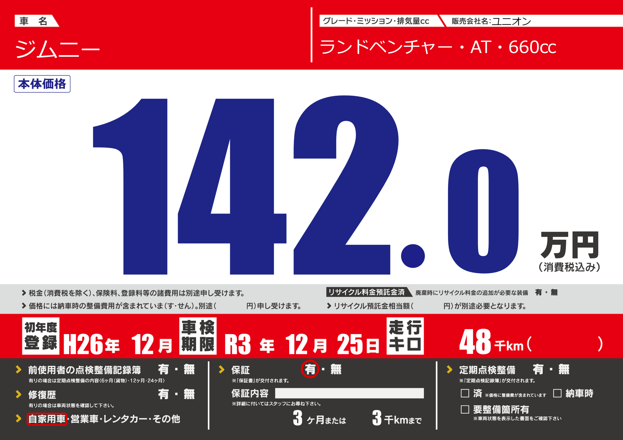 保証付き 保証内容(---) 3ヶ月または(3)千kmまで |