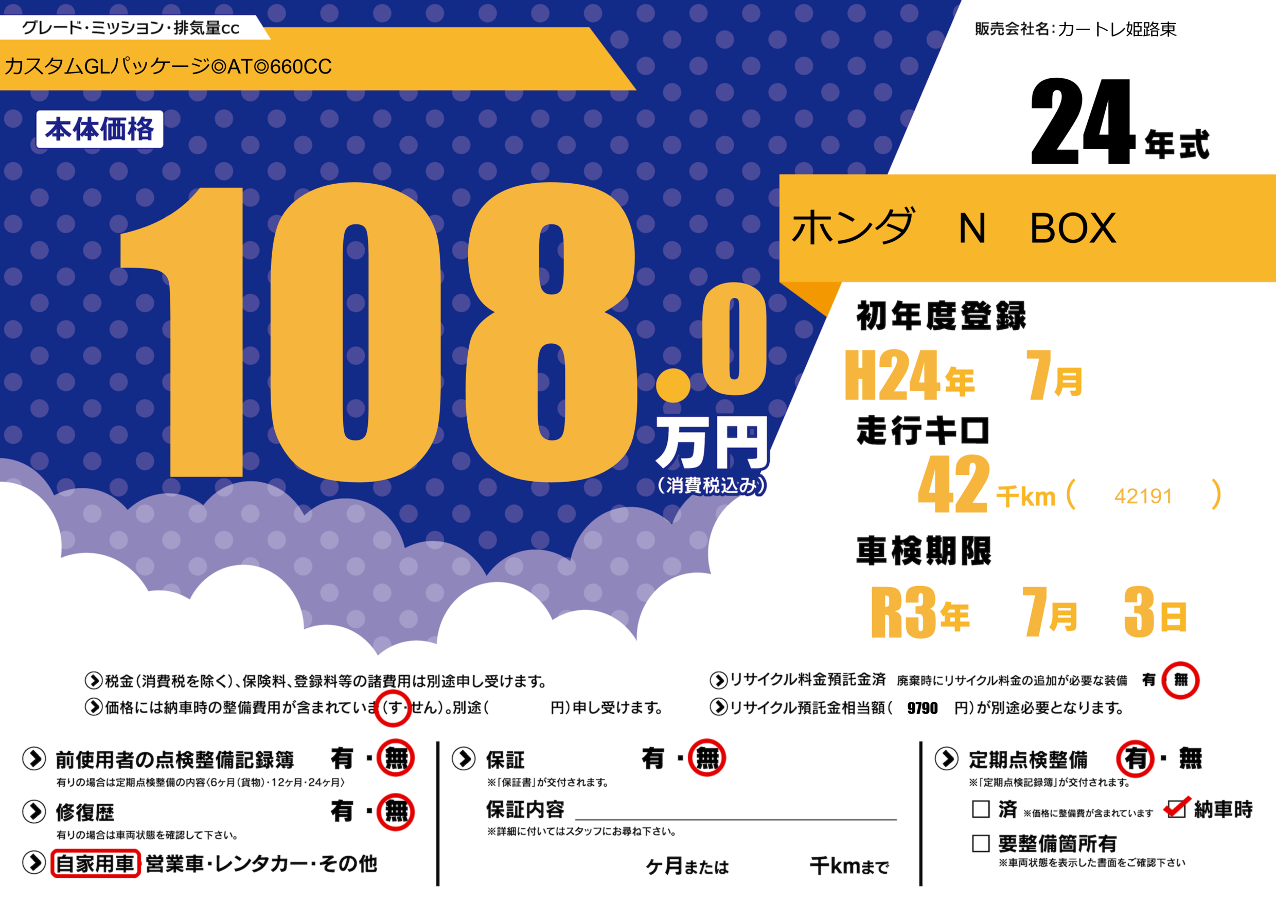 | 車名 | ホンダ N BOX | グレード ミッション 排気量 |