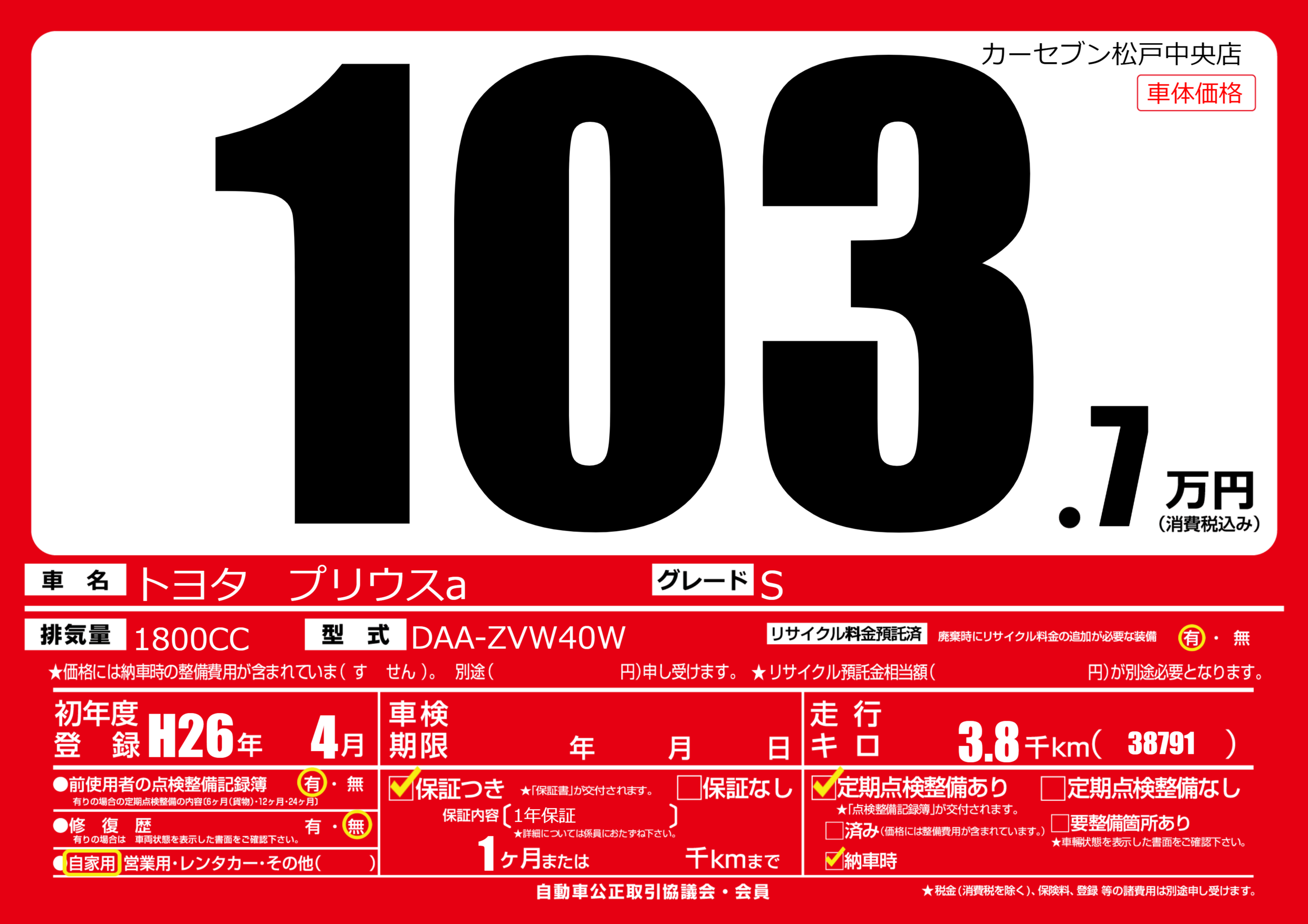 | 車名 | トヨタ プリウスa | グレード ミッション 排気量 |