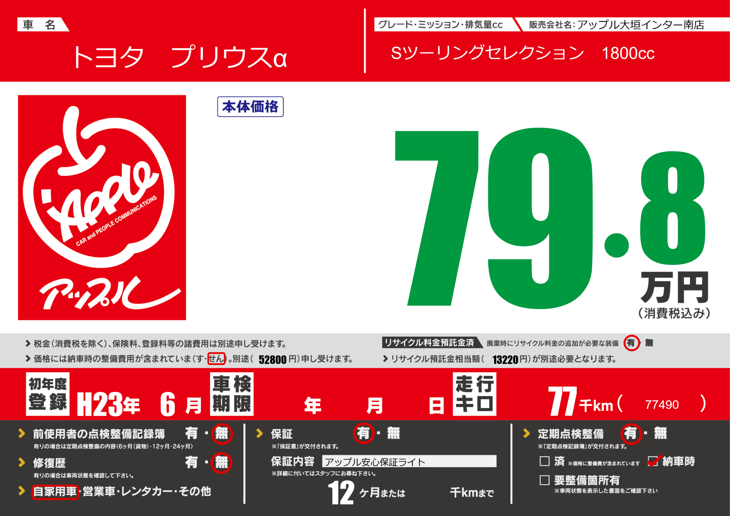 | 車名 | トヨタ プリウスα | グレード ミッション 排気量 |