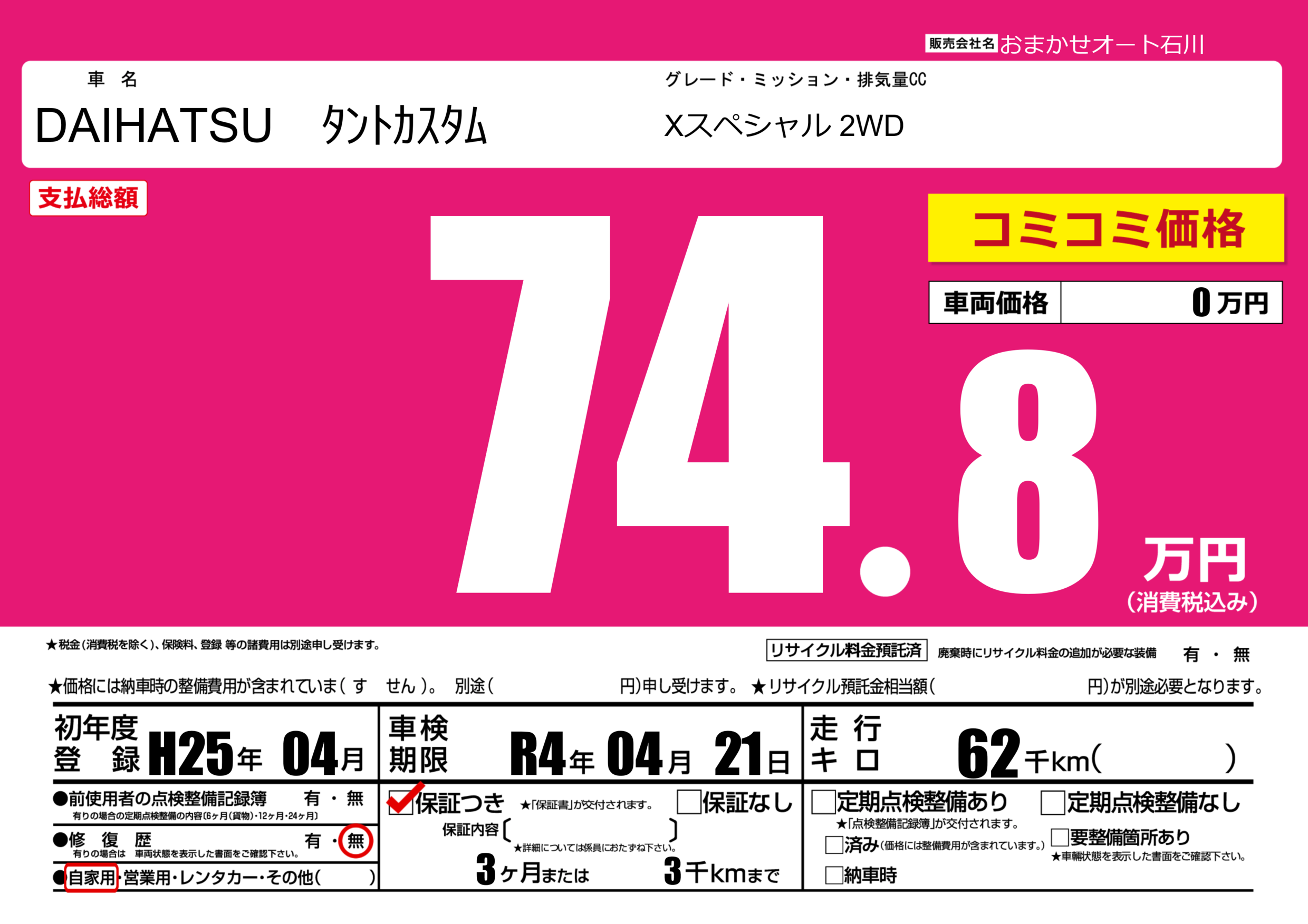 | 車名 | DAIHATSU タントカスタム | グレード ミッション 排気量 |