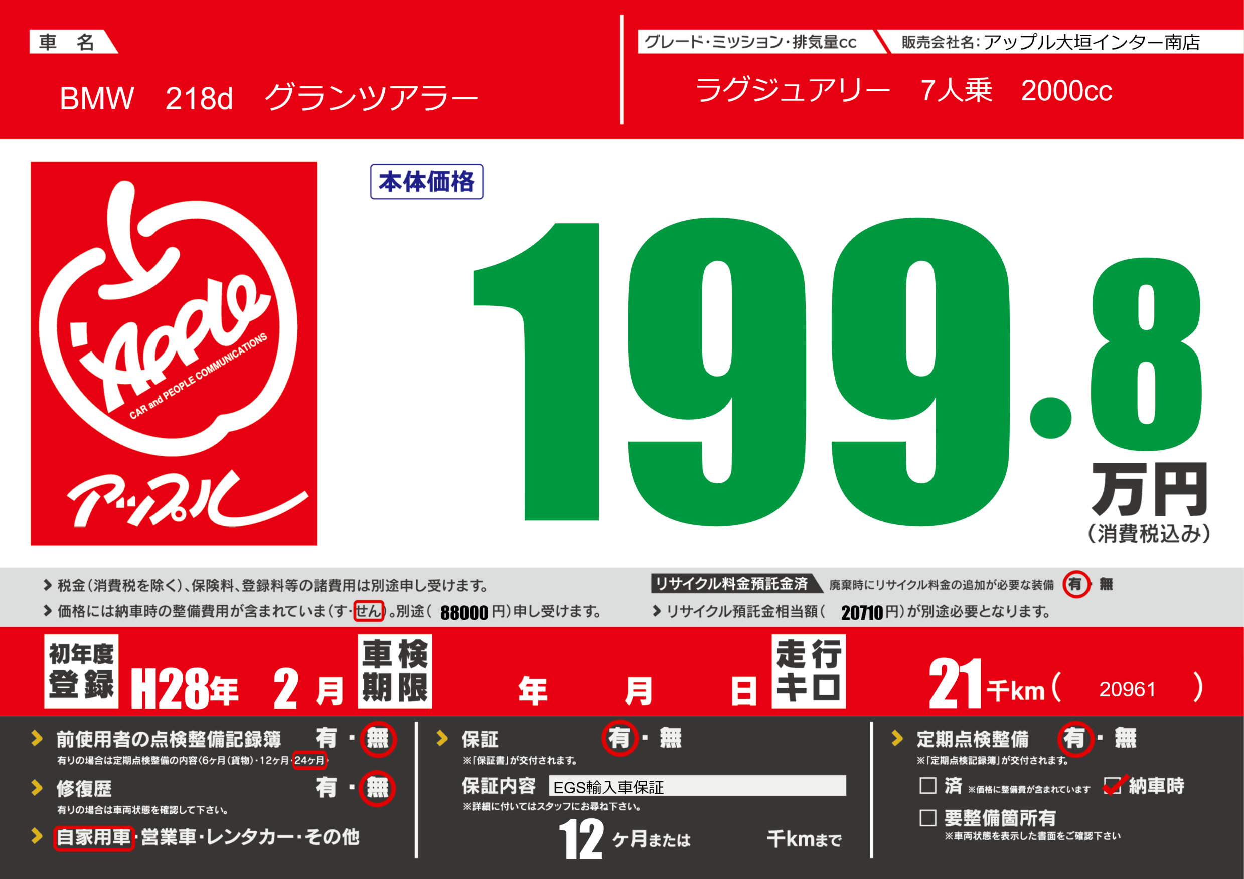 | 車名 | BMW 218d グランツアラー | グレード ミッション 排気量 |