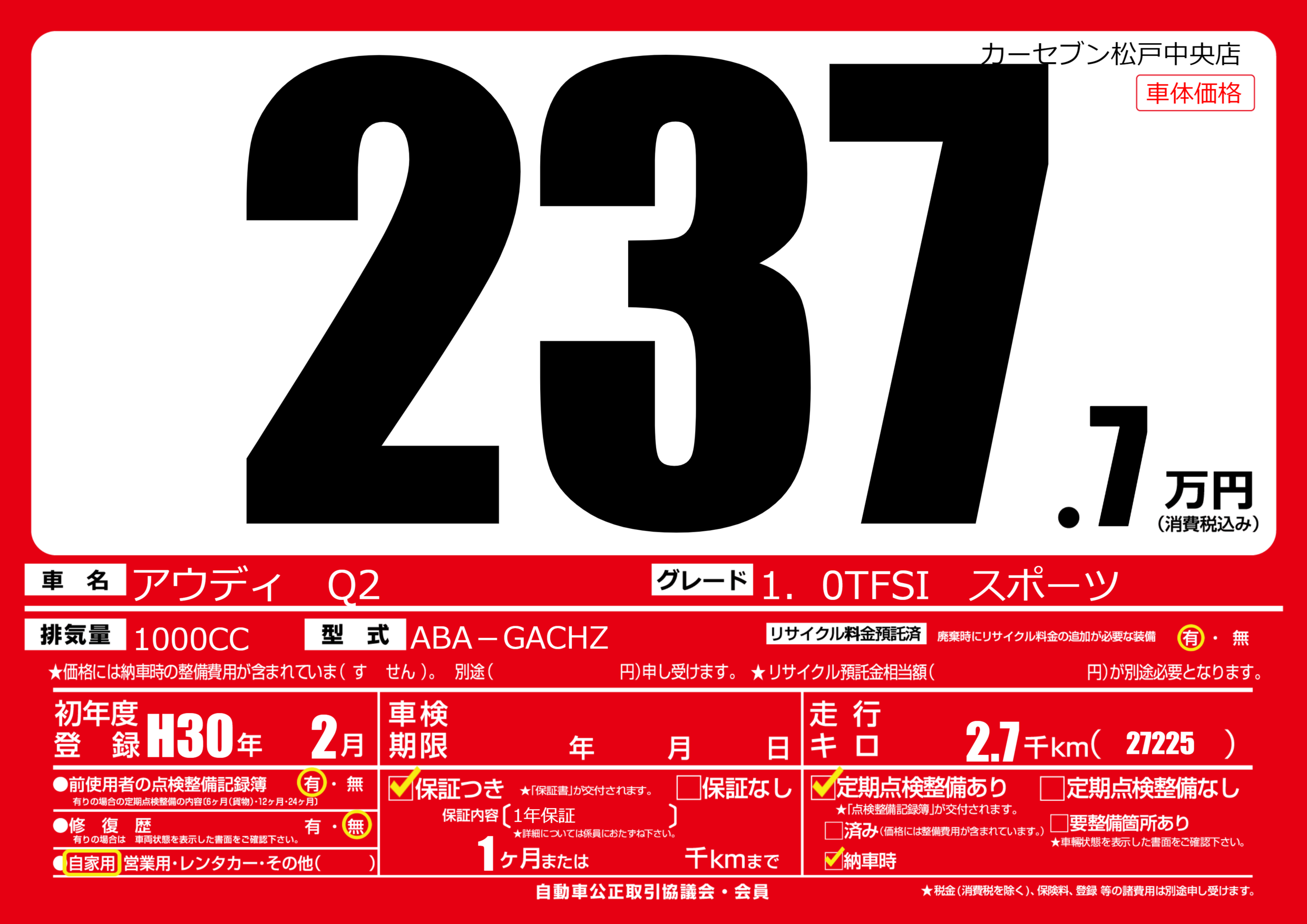 | 車名 | アウディ Q2 | グレード ミッション 排気量 |