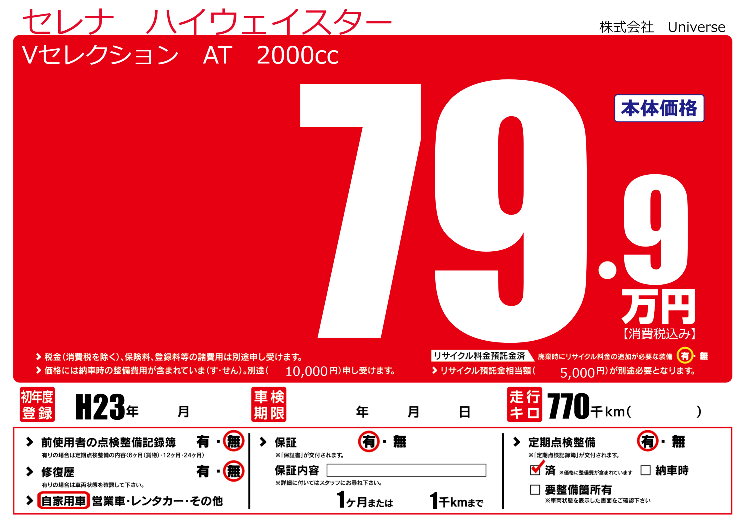 | 定期点検整備 | 定期点検整備あり 定期点検整備済み | ||