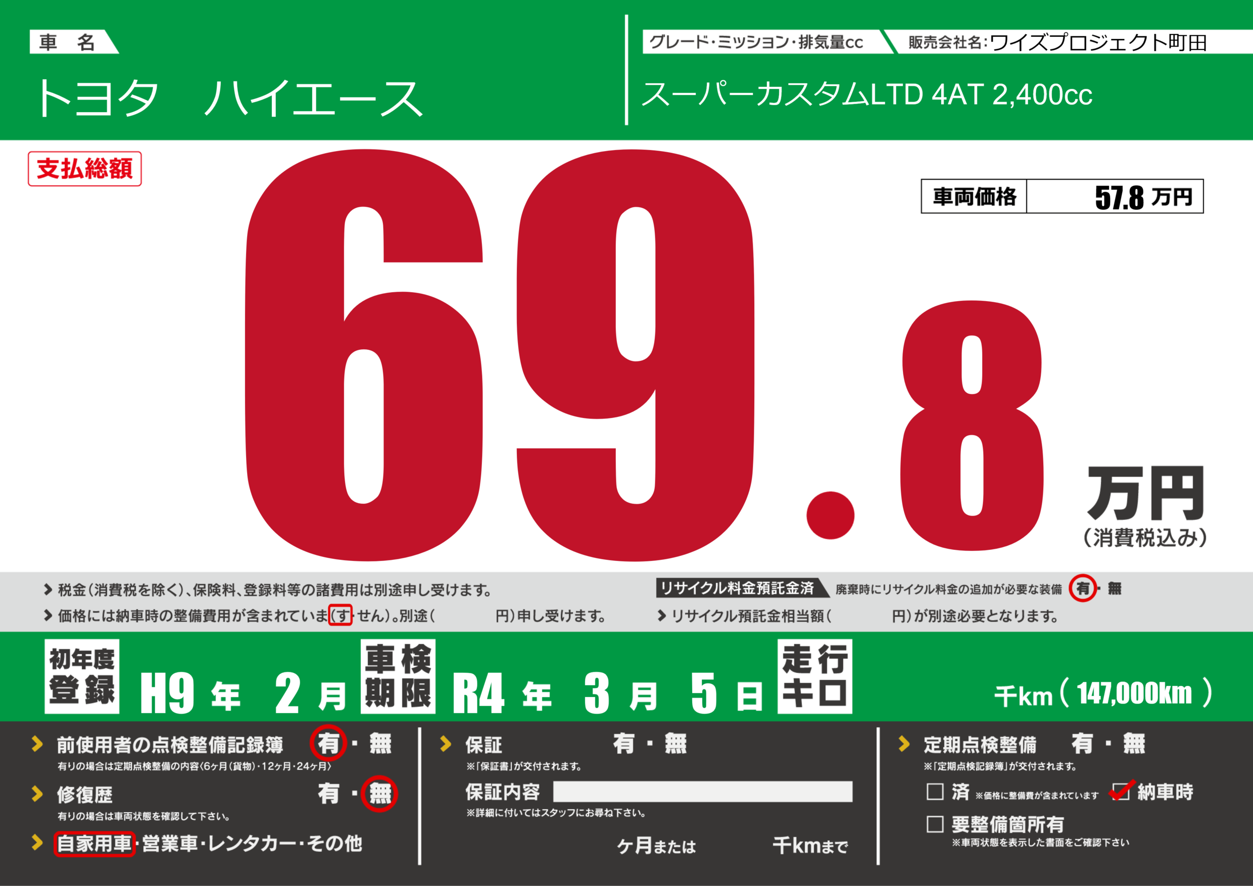 | 車名 | トヨタ ハイエース | グレード ミッション 排気量 |