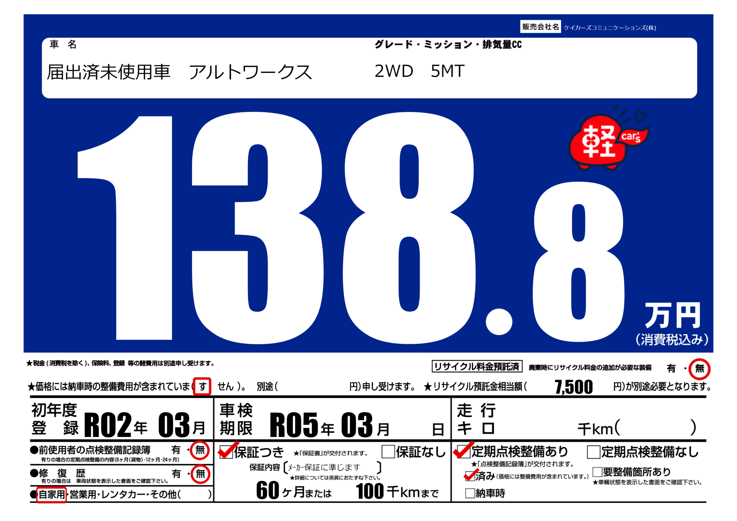 | 車名 | 届出済未使用車 アルトワークス | グレード ミッション 排気量 |