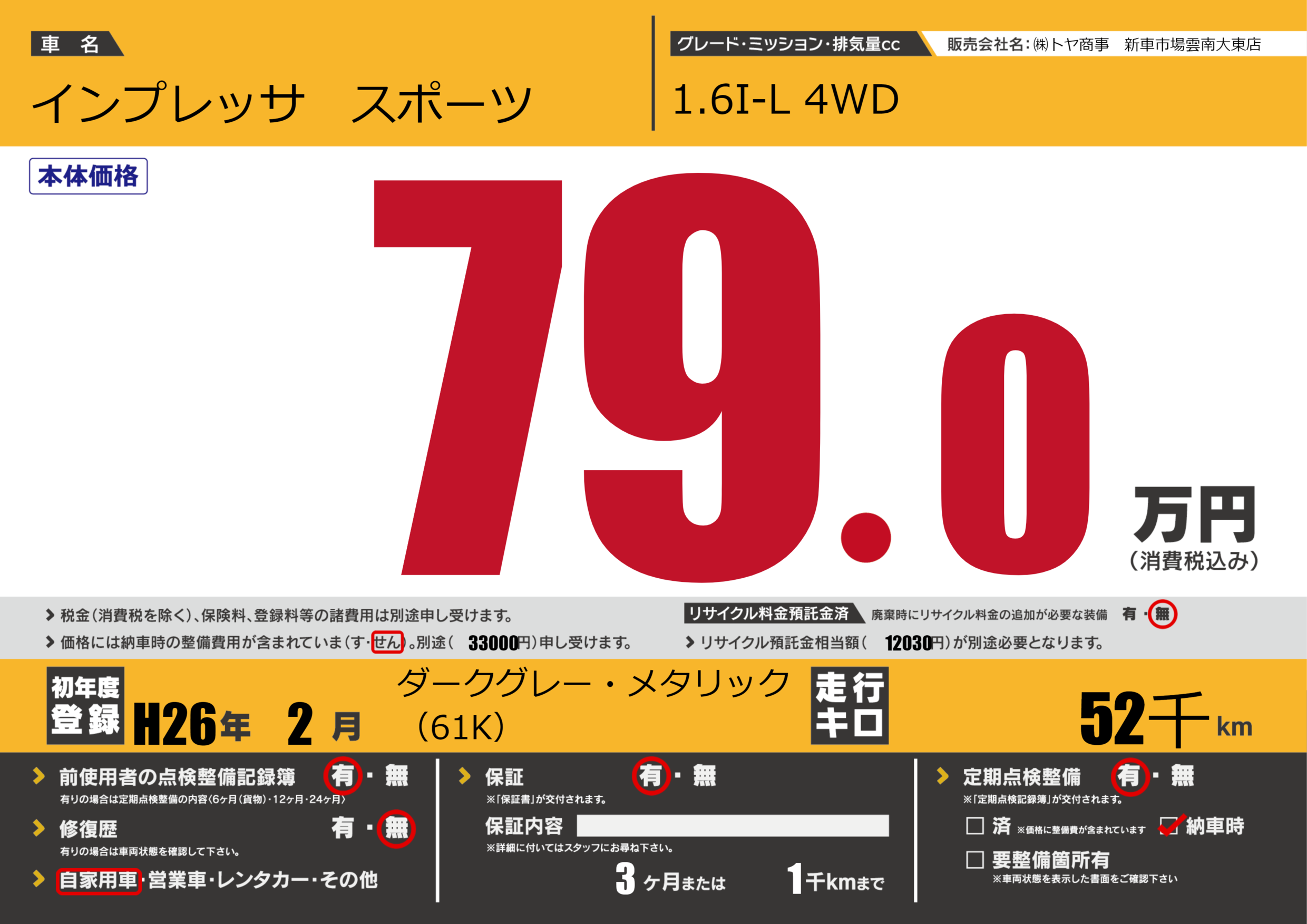 | 車名 | インプレッサ スポーツ | グレード ミッション 排気量 |