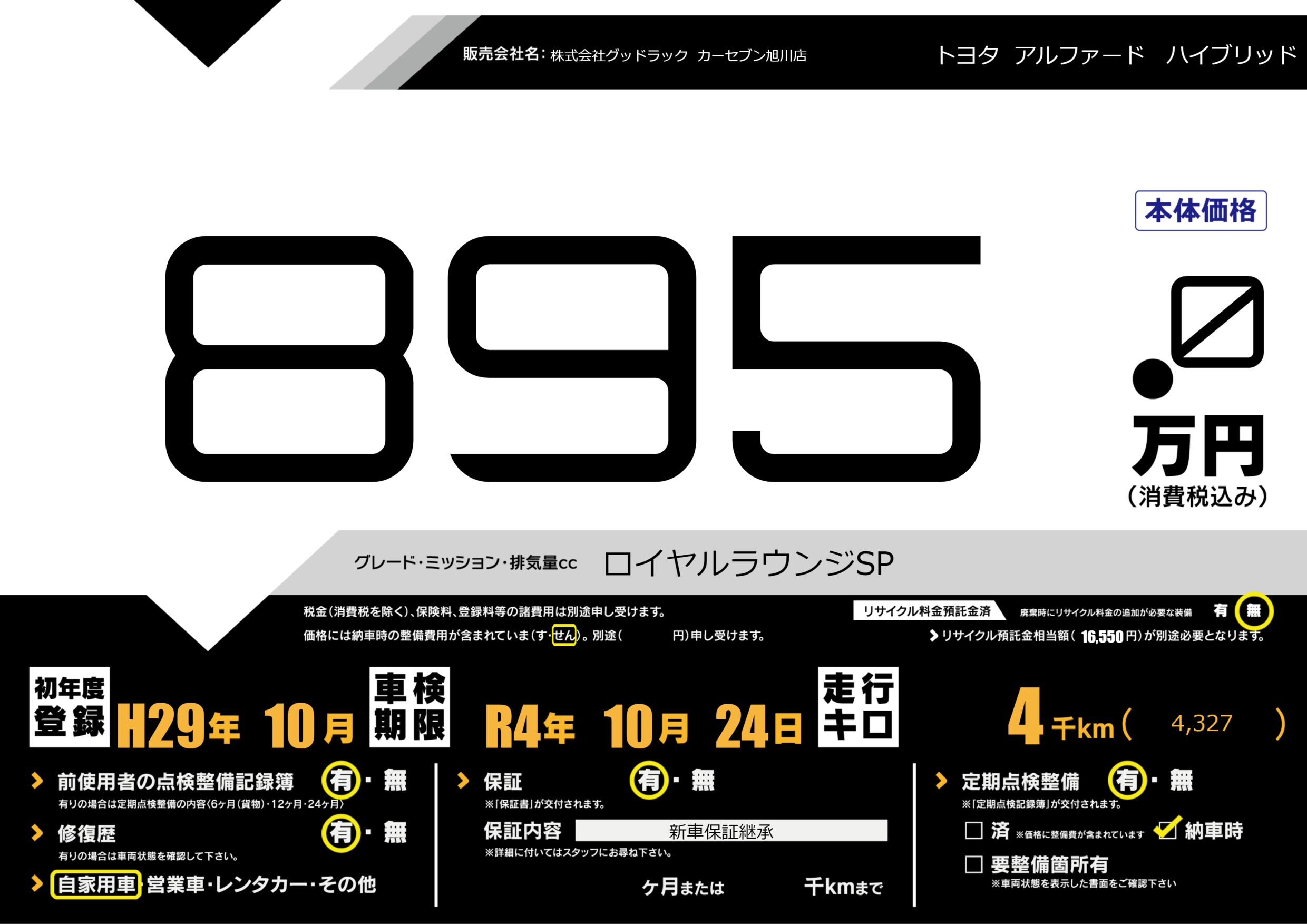 | 走行キロ | 0.4万km | 初年度登録 | H29年10月 |