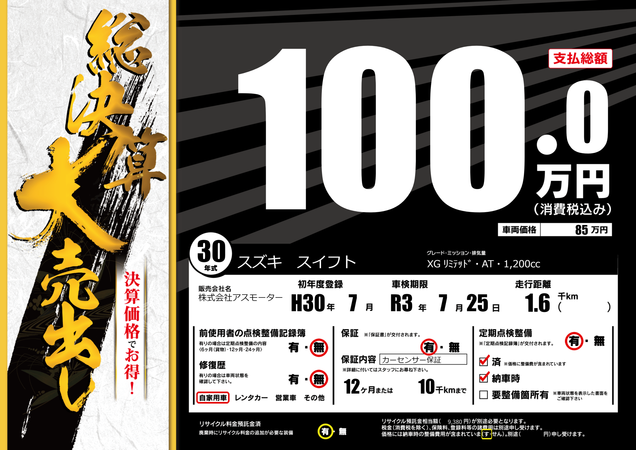 | 定期点検整備 | 定期点検整備あり 定期点検整備済み 納車時あり | ||