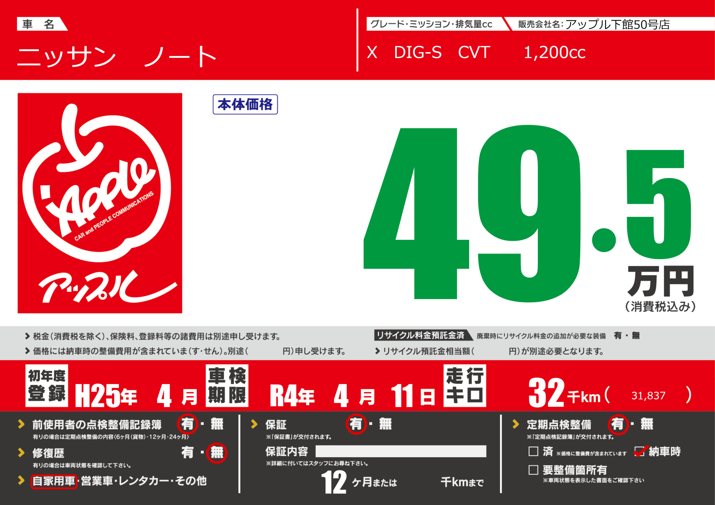 | 車名 | ニッサン ノート | グレード ミッション 排気量 |