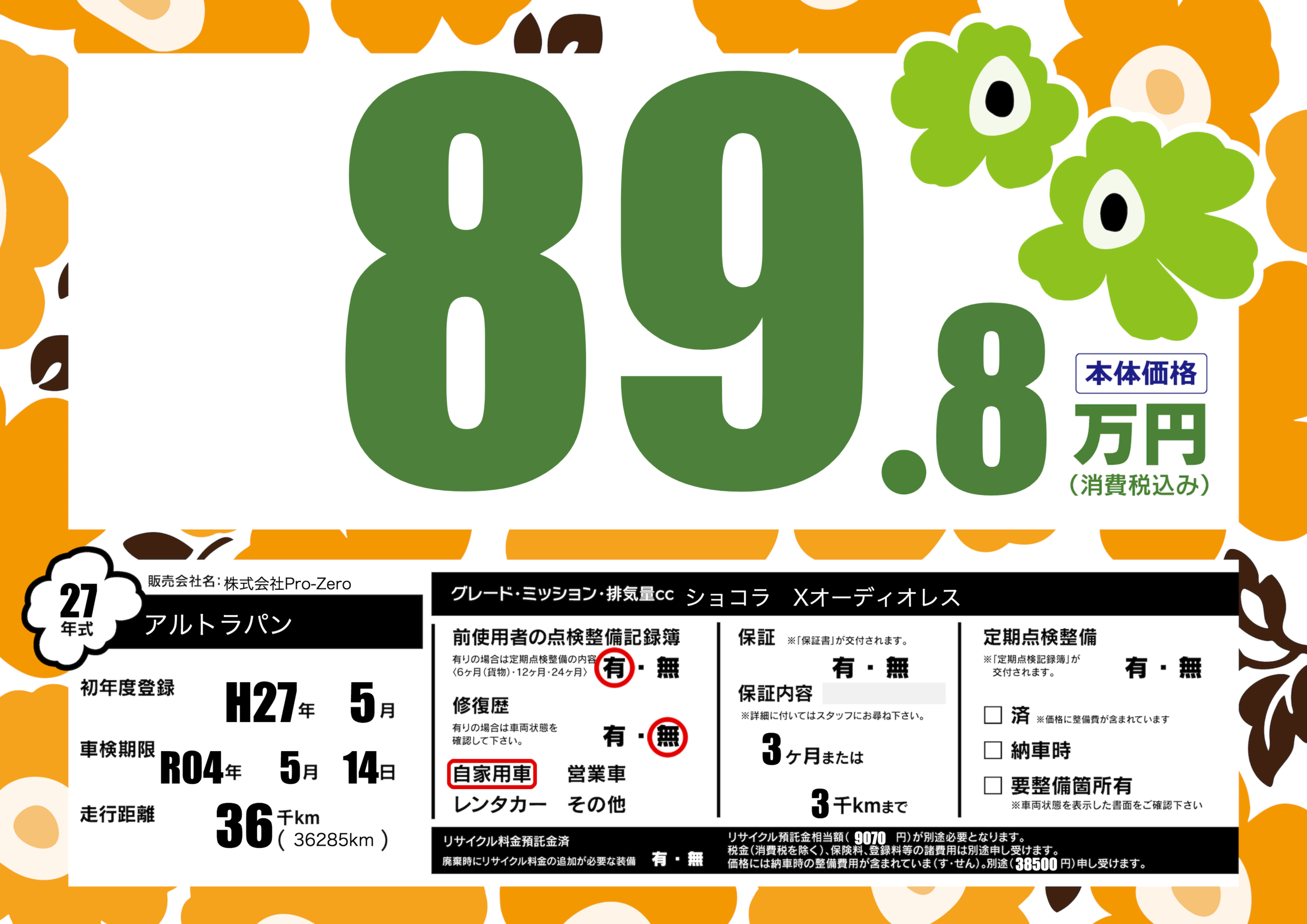 | 走行キロ | 3.6万km | 初年度登録 | H27年5月 |