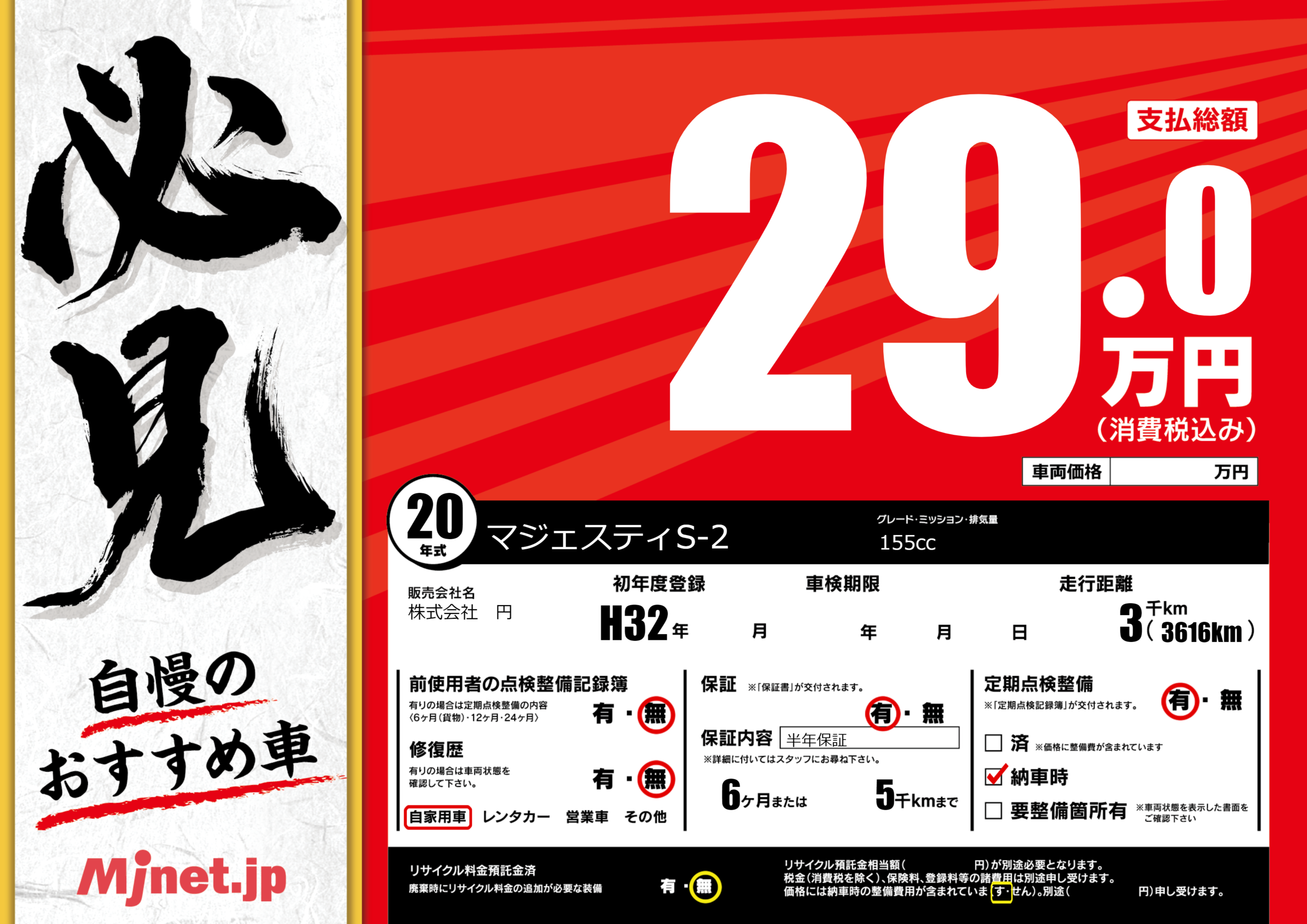 保証付き 保証内容(半年保証) 6ヶ月または5千km |