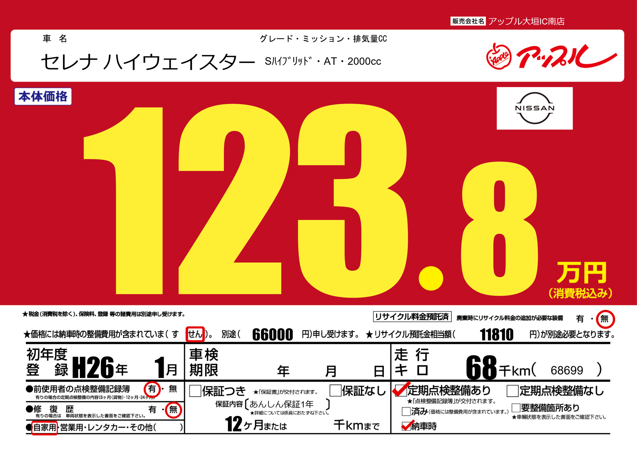 | 定期点検整備 | 定期点検整備あり 納車時あり | ||