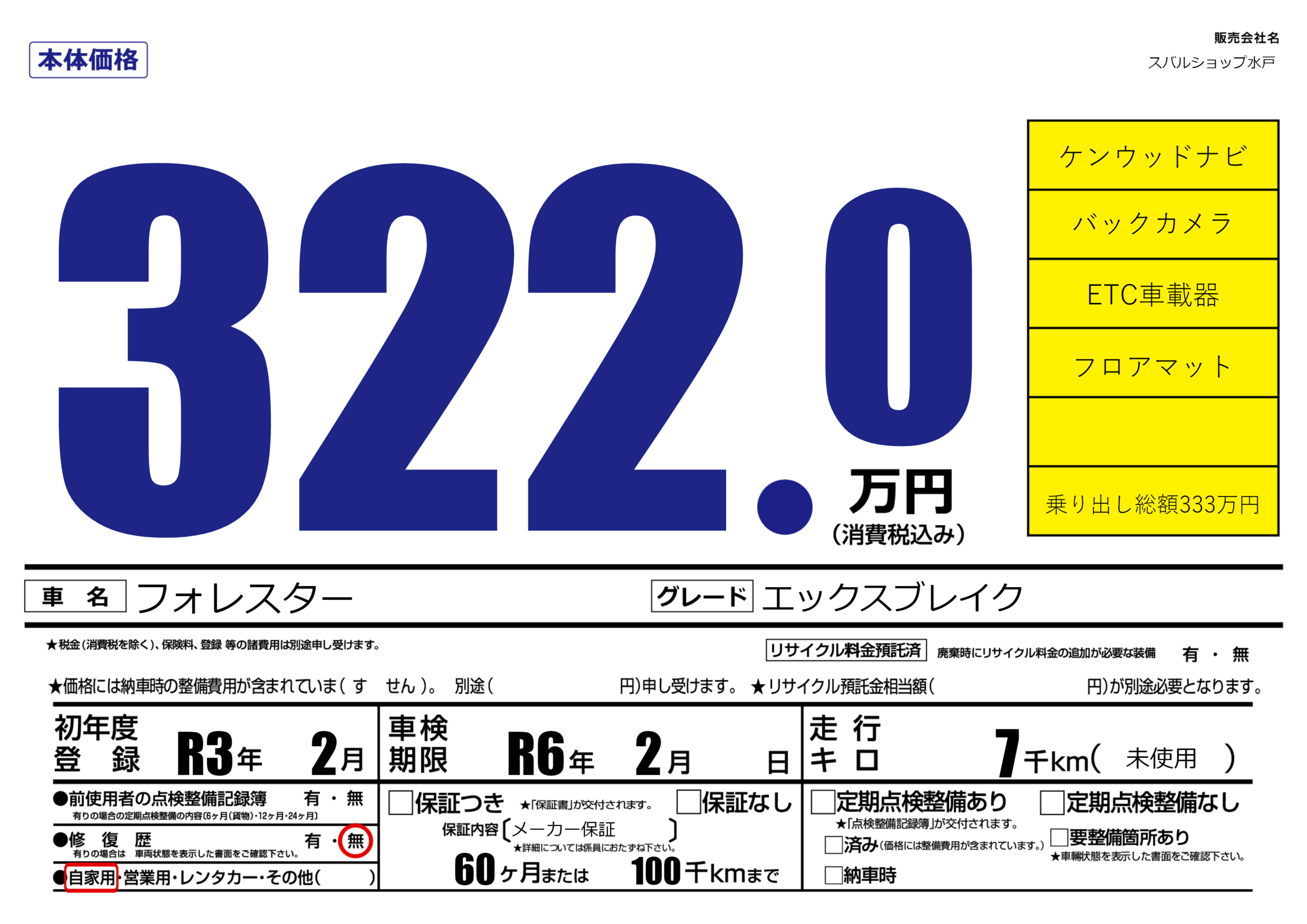 | 車名 | フォレスター | グレード ミッション 排気量 |