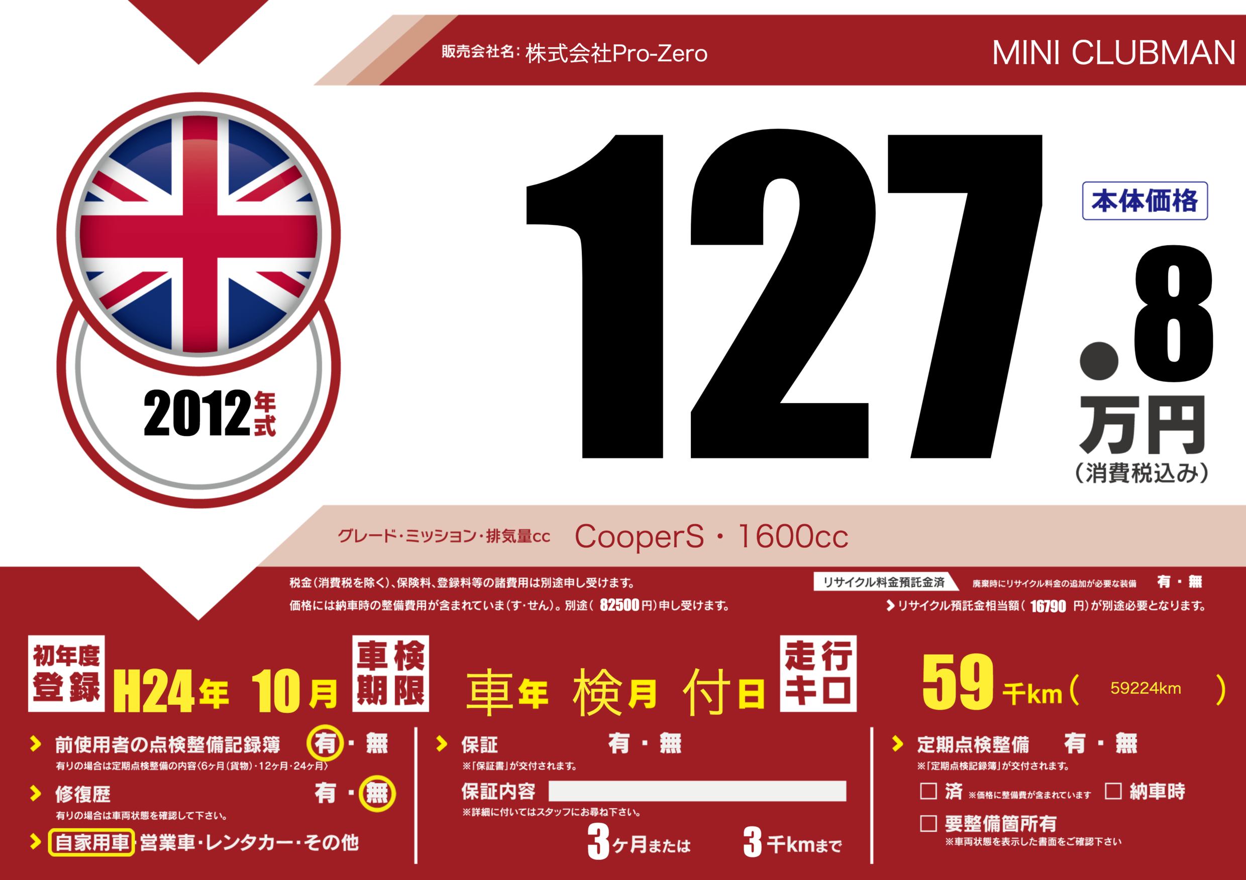 | 車名 | MINI CLUBMAN | グレード ミッション 排気量 |