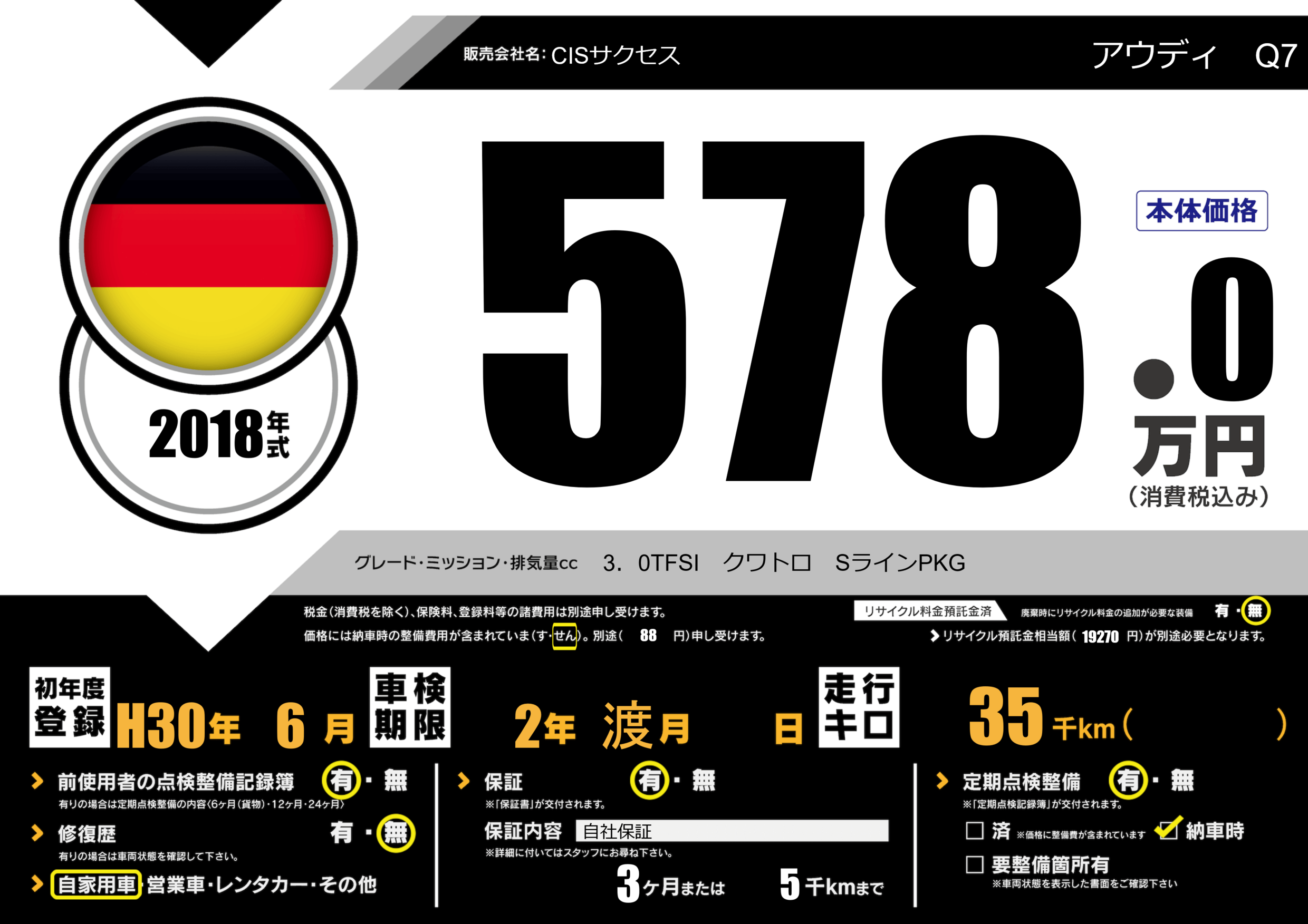 | 車名 | アウディ Q7 | グレード ミッション 排気量 |