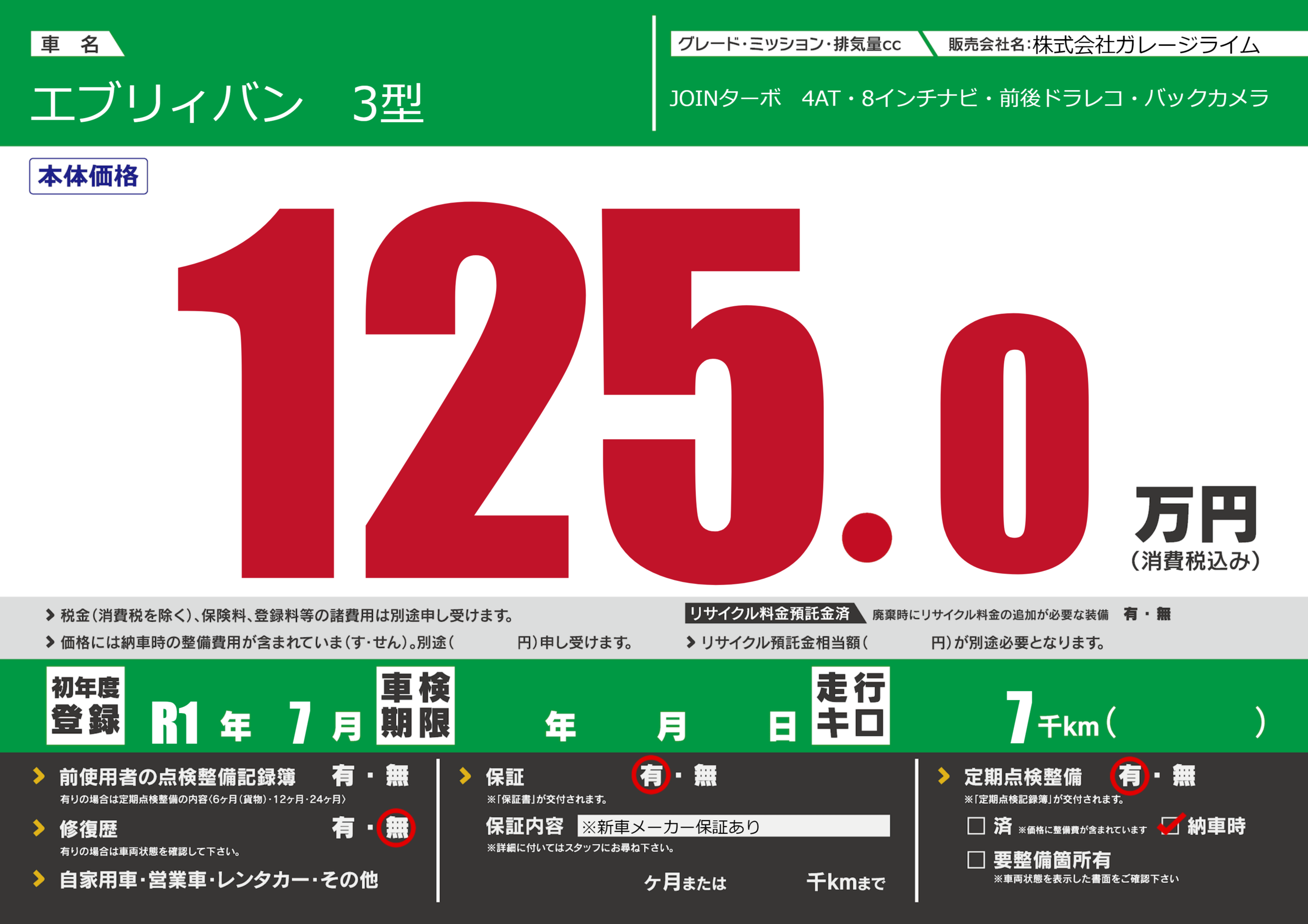 | 定期点検整備 | 定期点検整備あり 納車時あり | ||