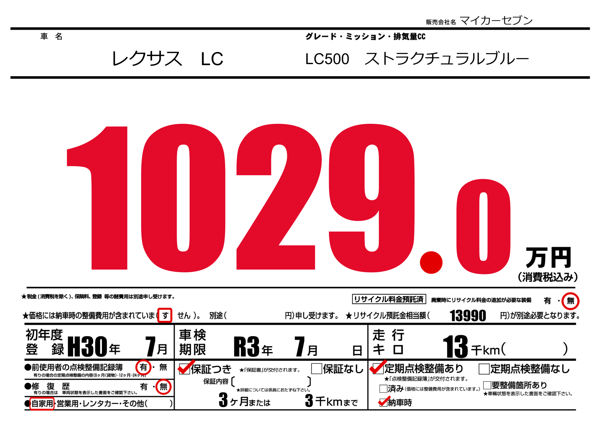 | 車名 | レクサス LC | グレード ミッション 排気量 |