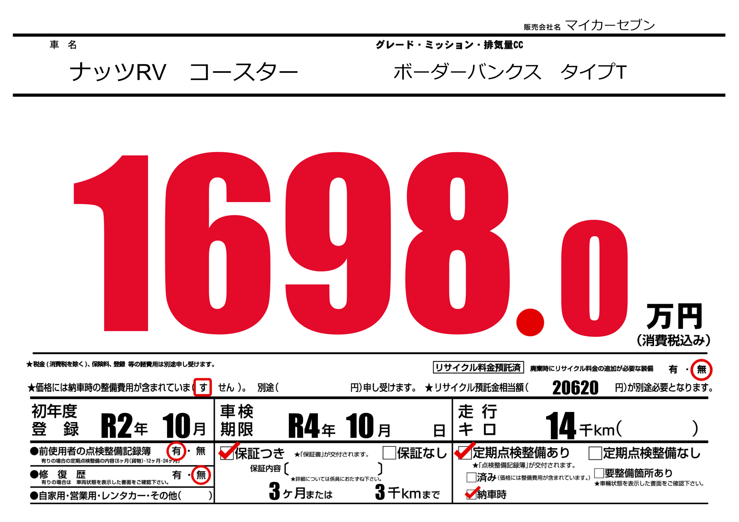 | 車名 | ナッツRV コースター | グレード ミッション 排気量 |