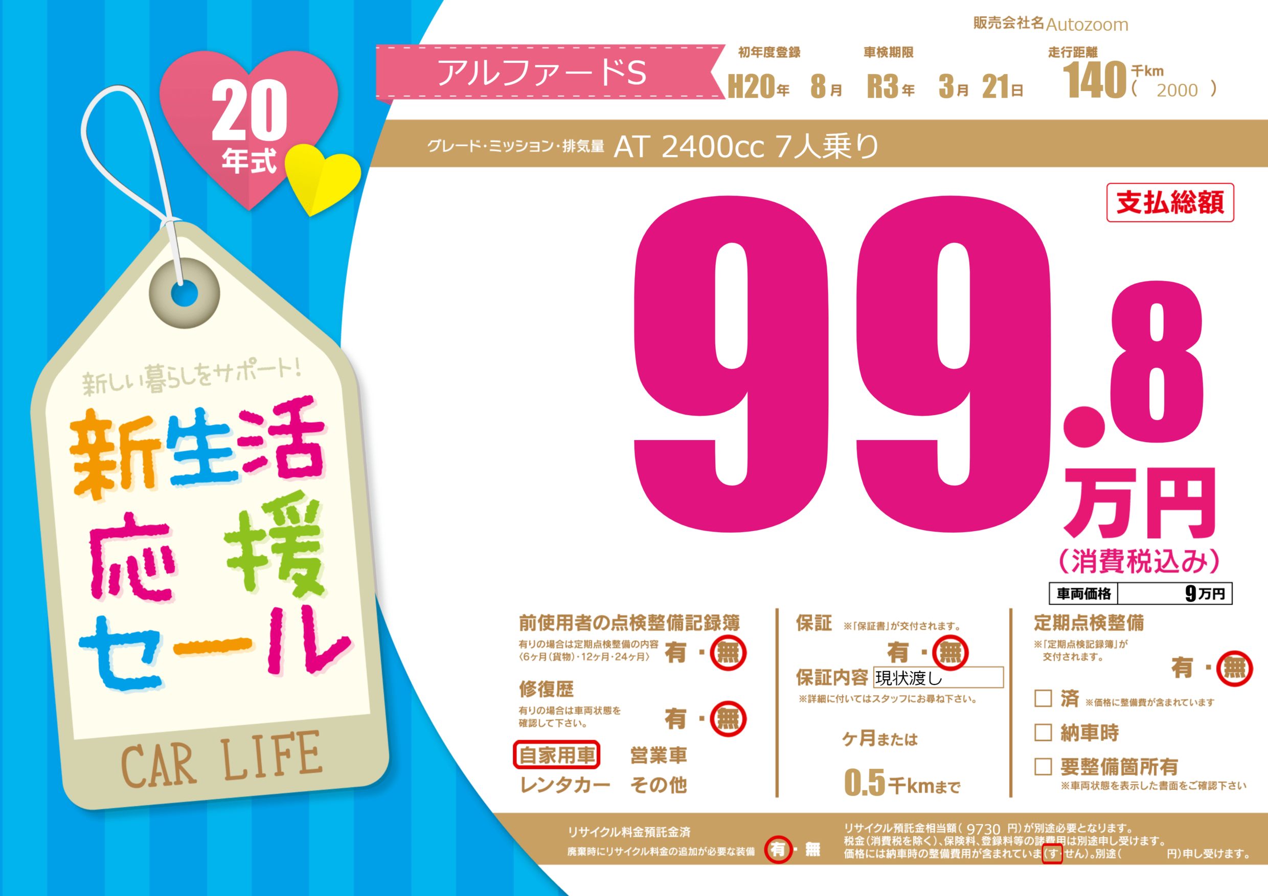 | 走行キロ | 14万km | 初年度登録 | H20年8月 |