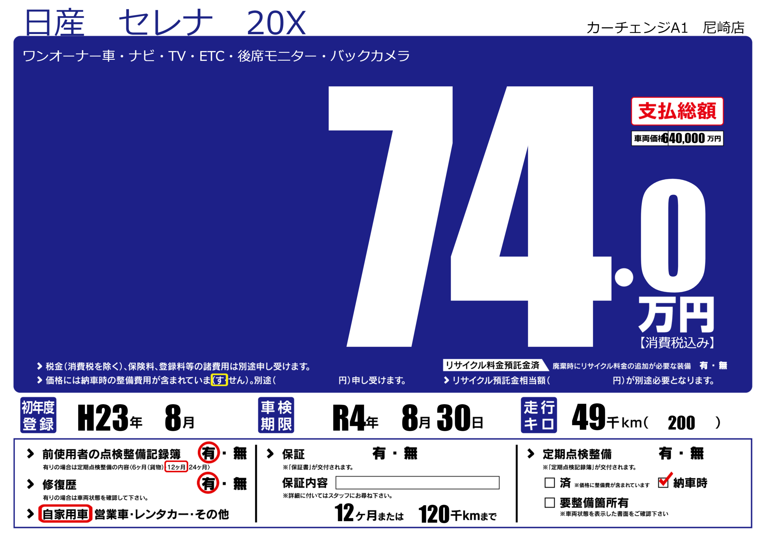 | 車名 | 日産 セレナ 20X | グレード ミッション 排気量 |