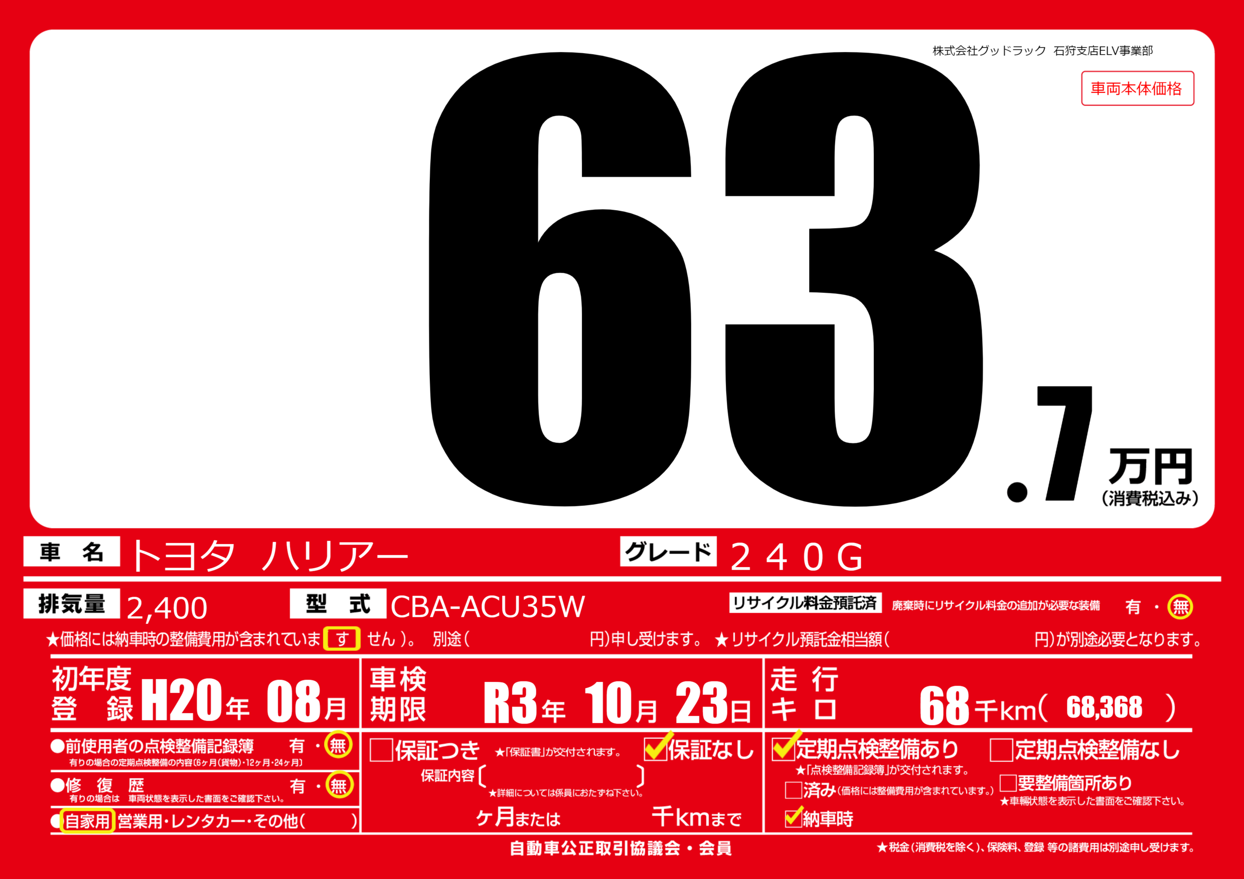 | 車名 | トヨタ ハリアー | グレード ミッション 排気量 |