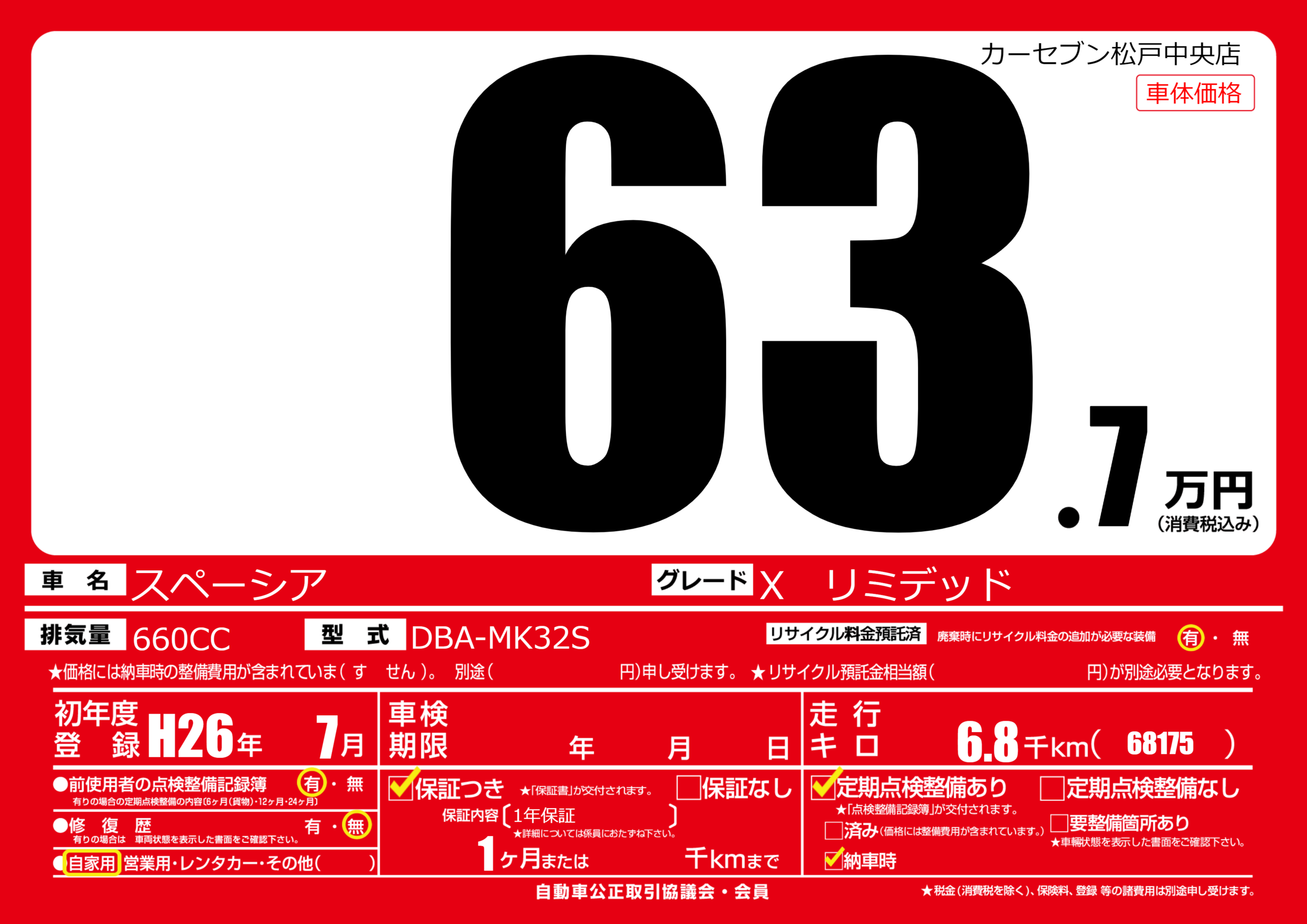 | 走行キロ | 0.6万km | 初年度登録 | H26年7月 |