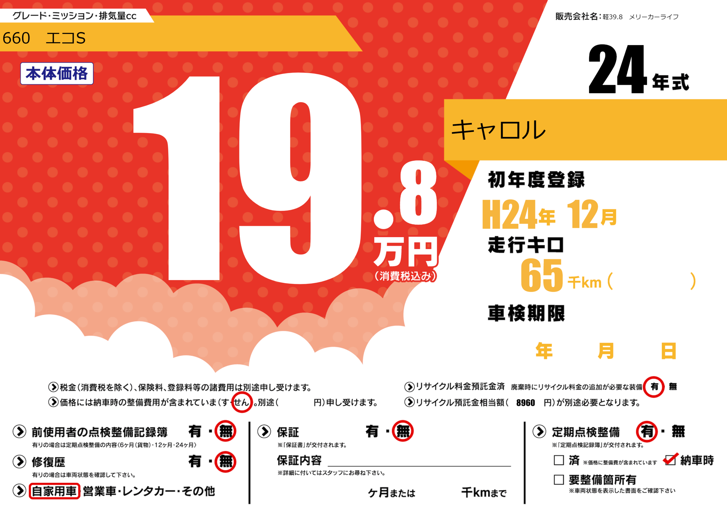 | 車名 | キャロル | グレード ミッション 排気量 |