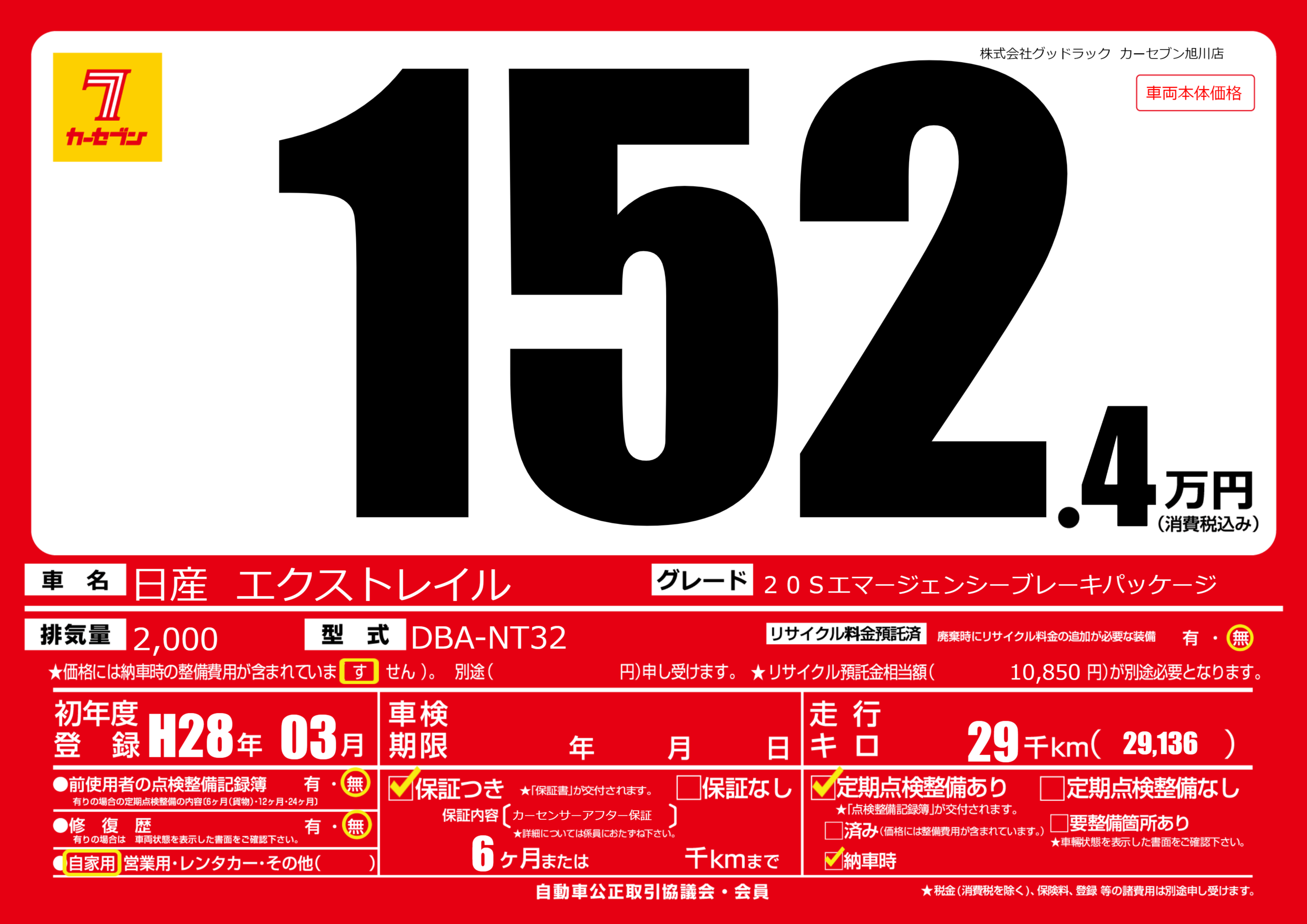| 車名 | 日産 エクストレイル | グレード ミッション 排気量 |