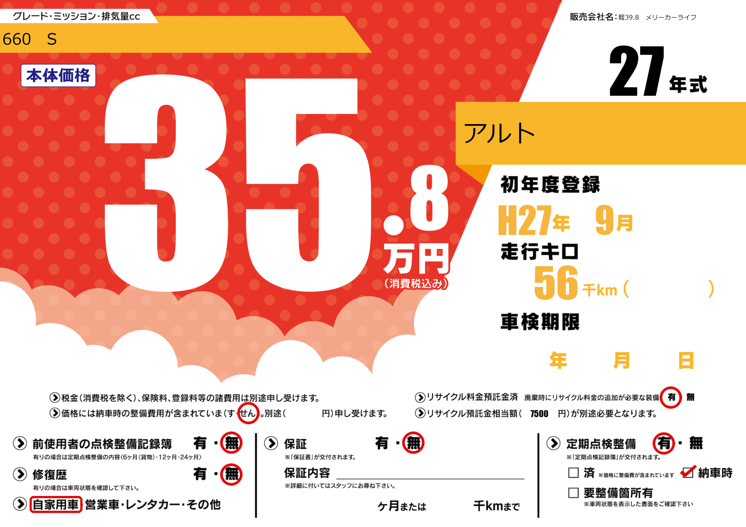 | 定期点検整備 | 定期点検整備あり 納車時あり | ||