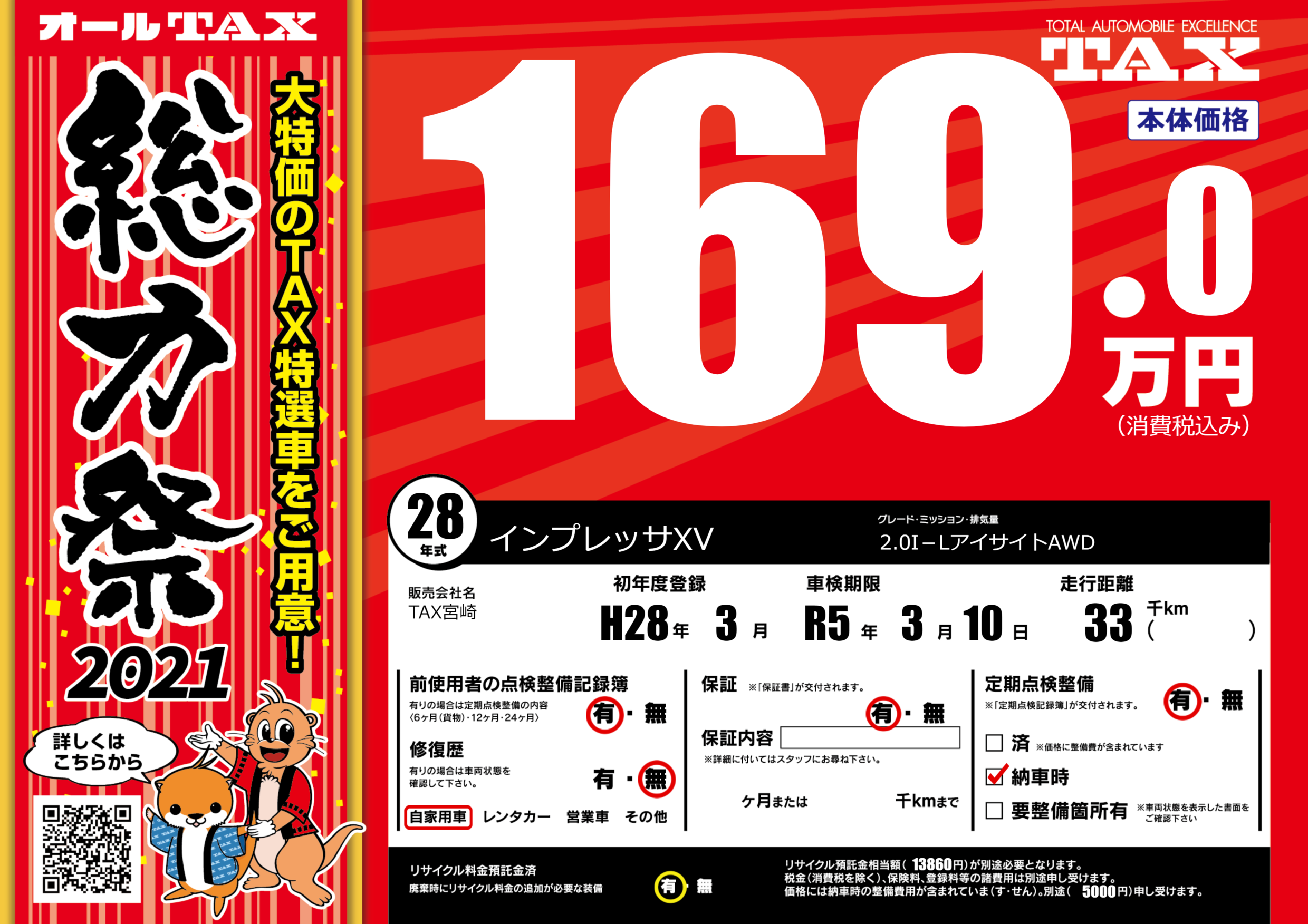 | 車名 | インプレッサXV | グレード ミッション 排気量 |