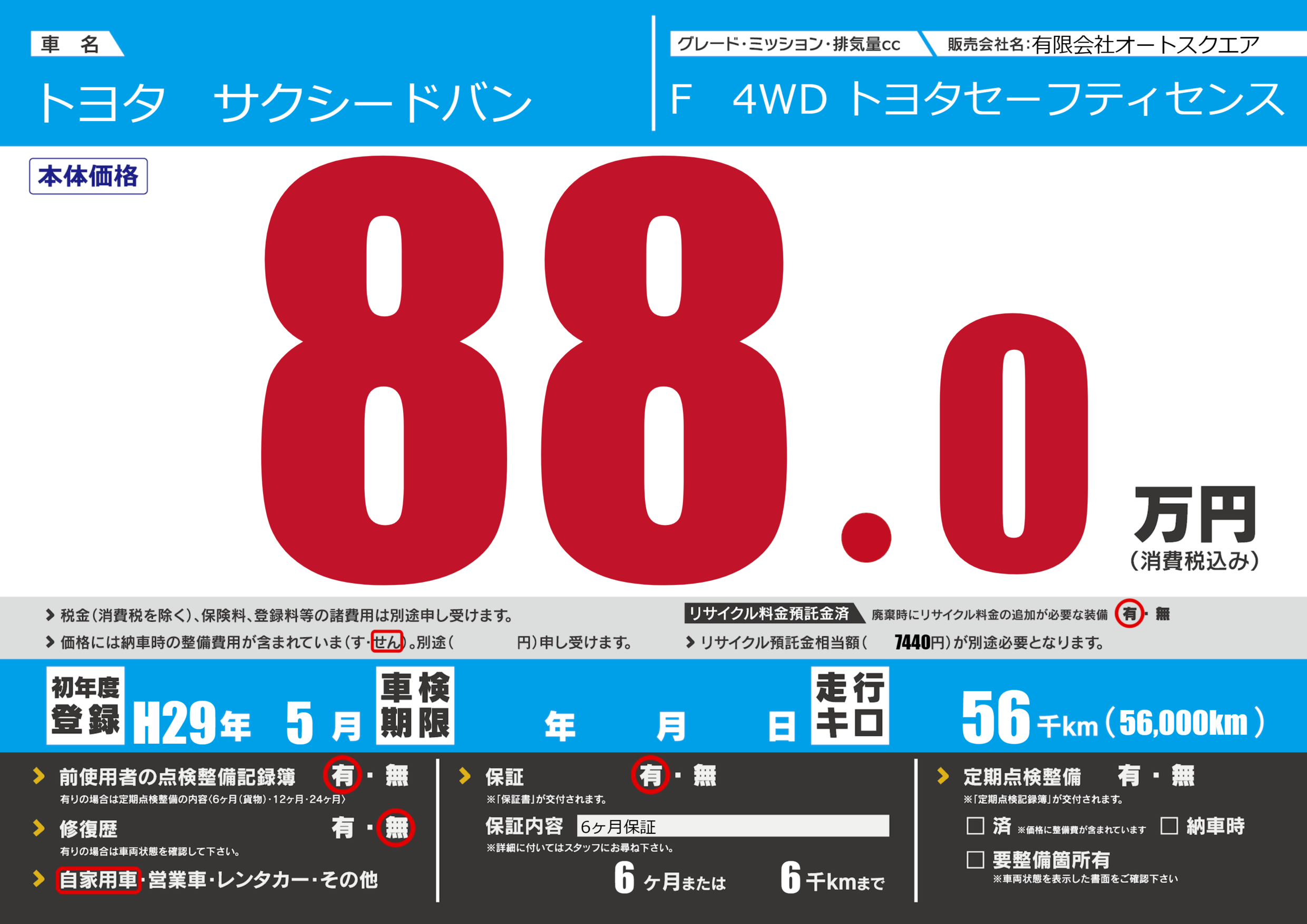 | 車名 | トヨタ サクシードバン | グレード ミッション 排気量 |