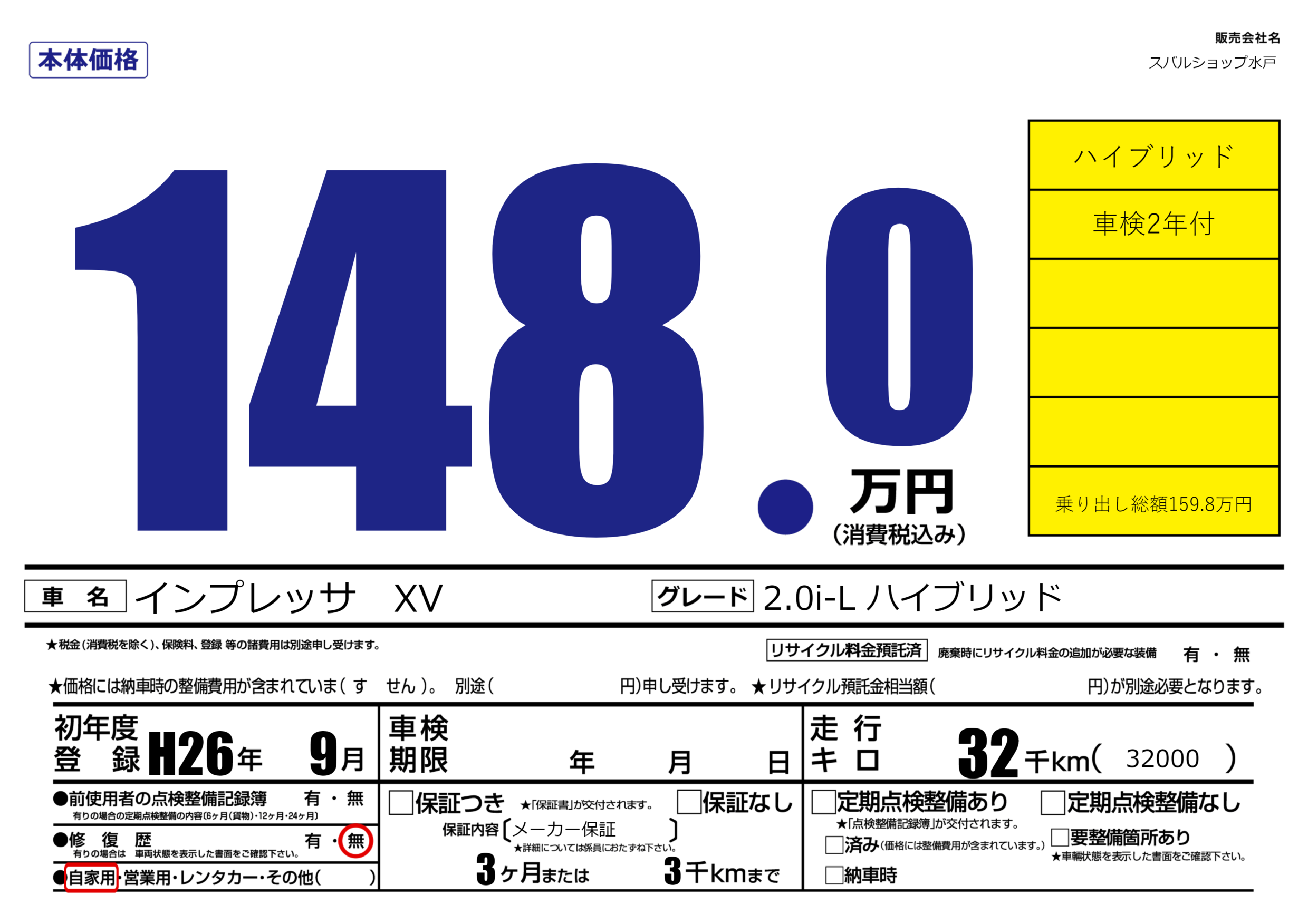 | 走行キロ | 3.2万km | 初年度登録 | H26年9月 |