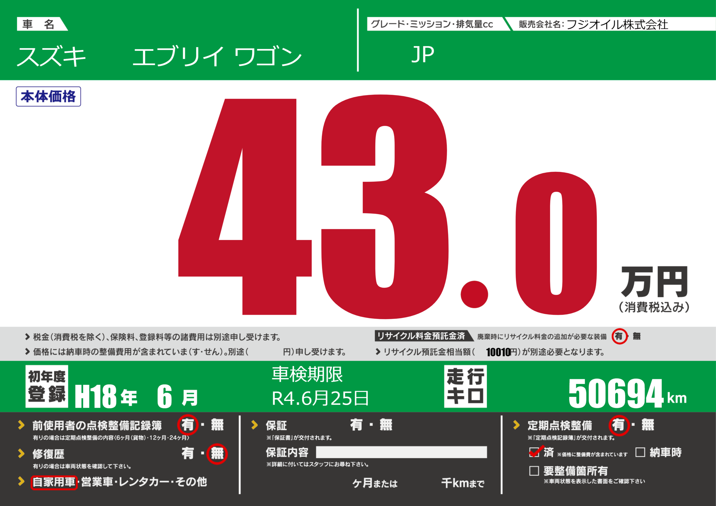 | 定期点検整備 | 定期点検整備あり 定期点検整備済み | ||