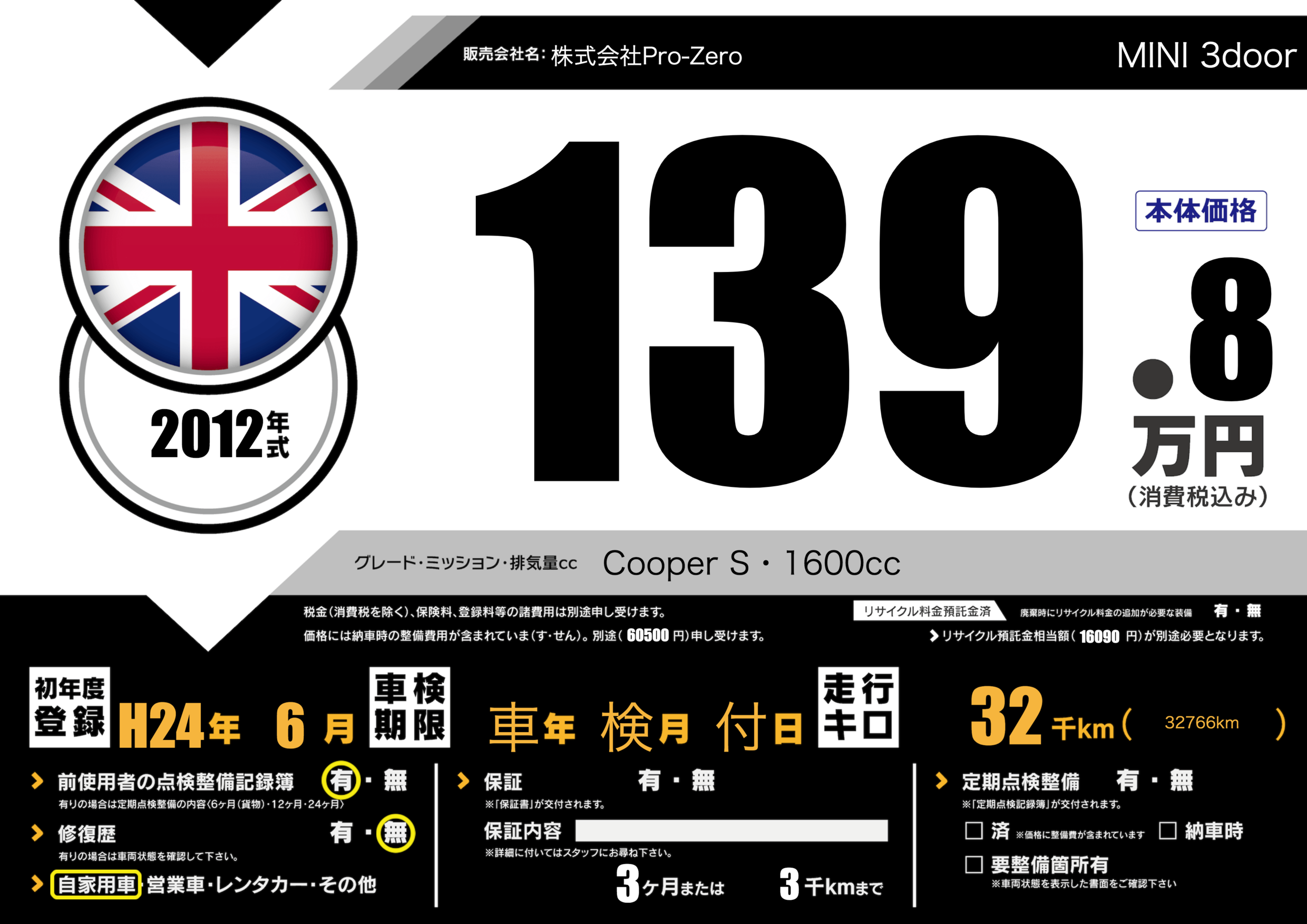 | 車名 | MINI 3door | グレード ミッション 排気量 |