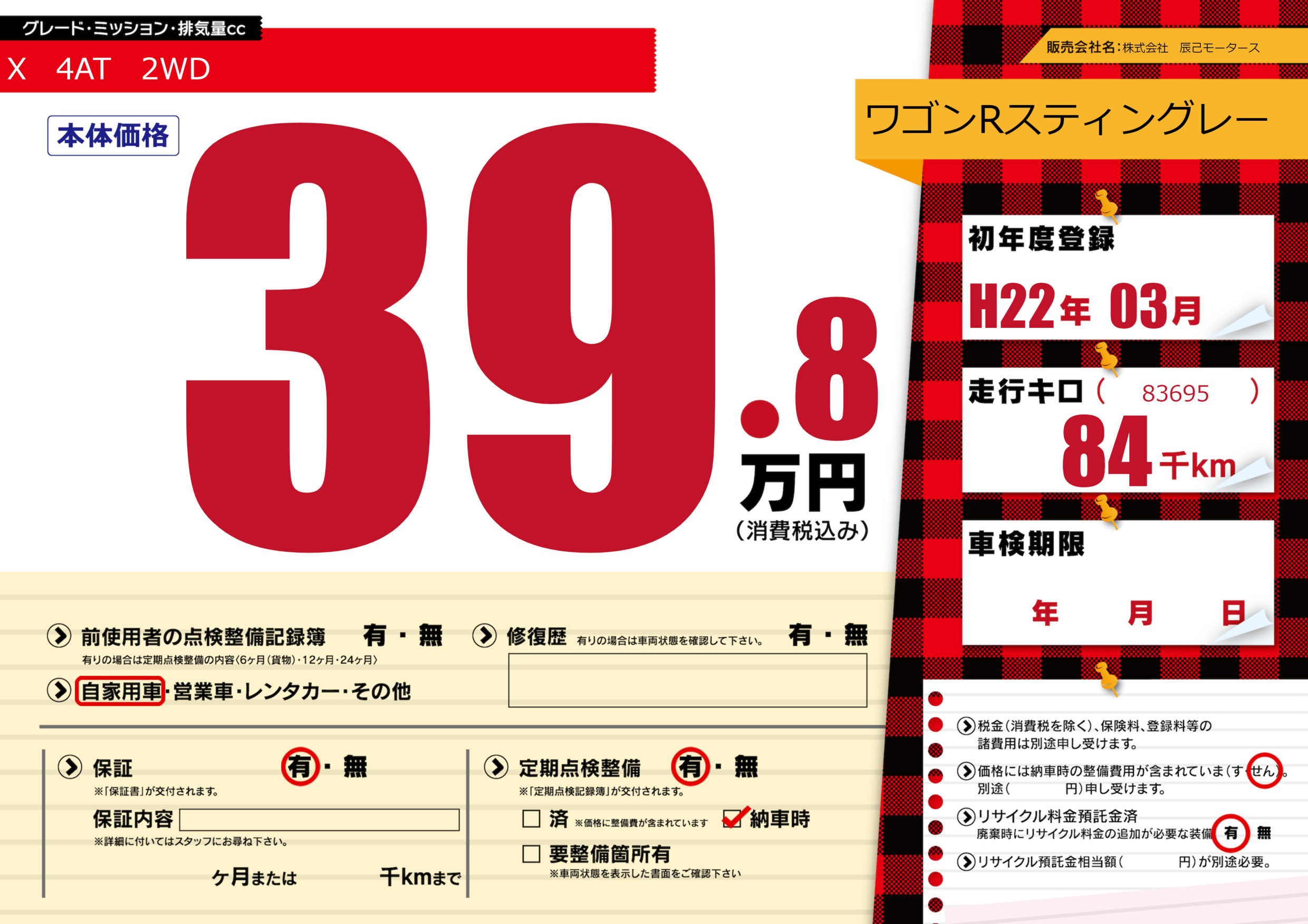 | 定期点検整備 | 定期点検整備あり 納車時あり | ||