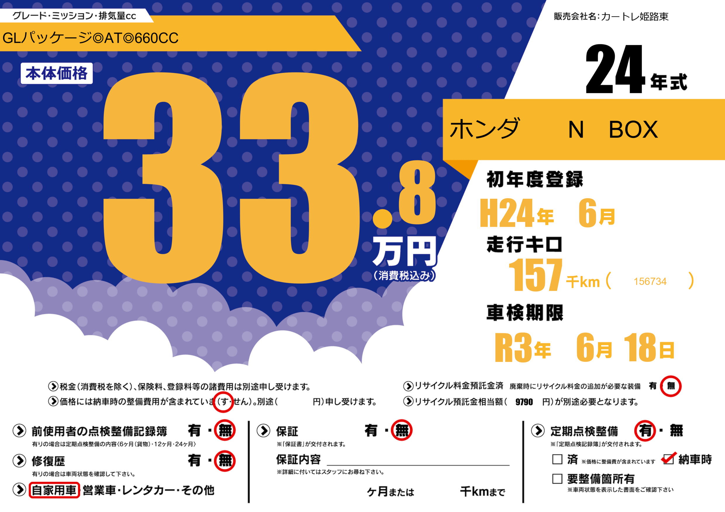 | 車名 | ホンダ N BOX | グレード ミッション 排気量 |