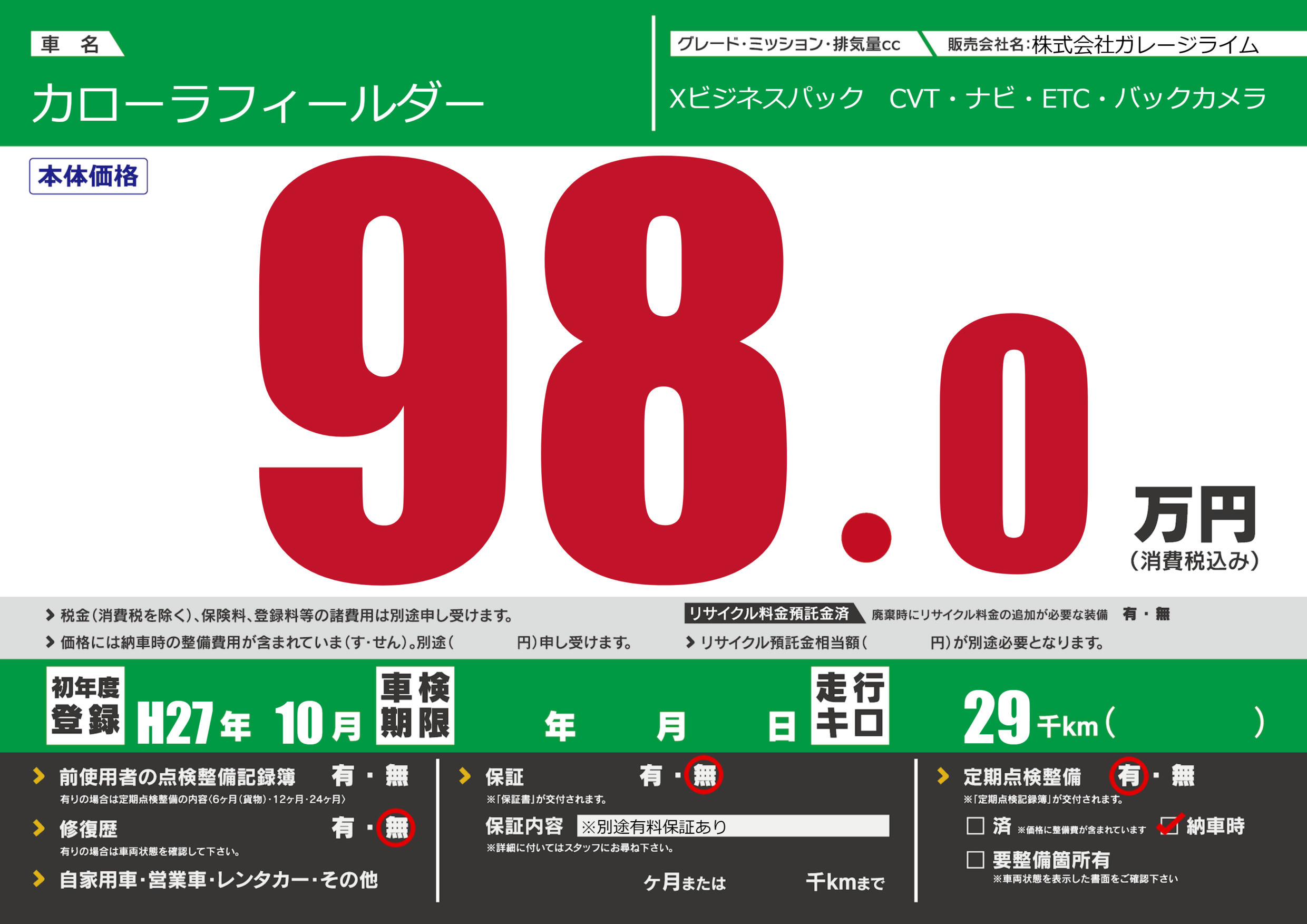 | 車名 | カローラフィールダー | グレード ミッション 排気量 |