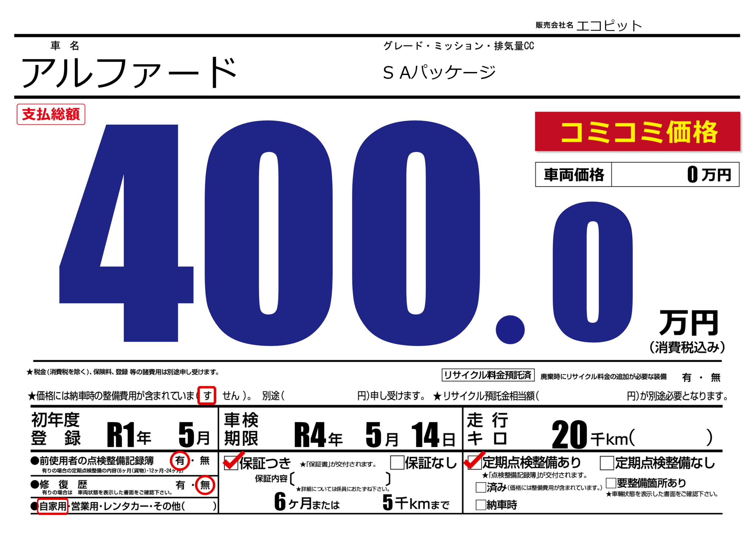 | 車名 | アルファード | グレード ミッション 排気量 |