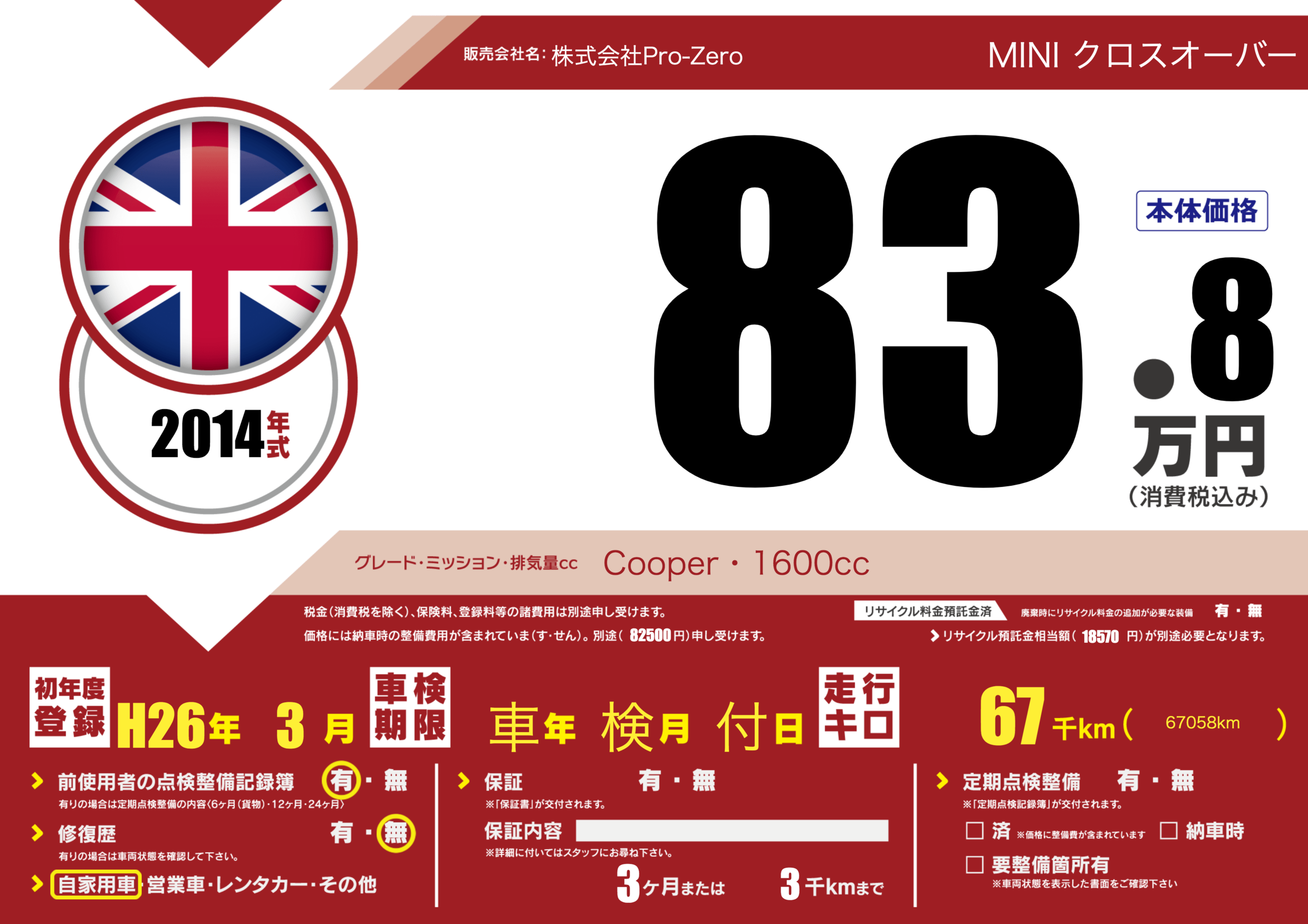| 車名 | MINI クロスオーバー | グレード ミッション 排気量 |