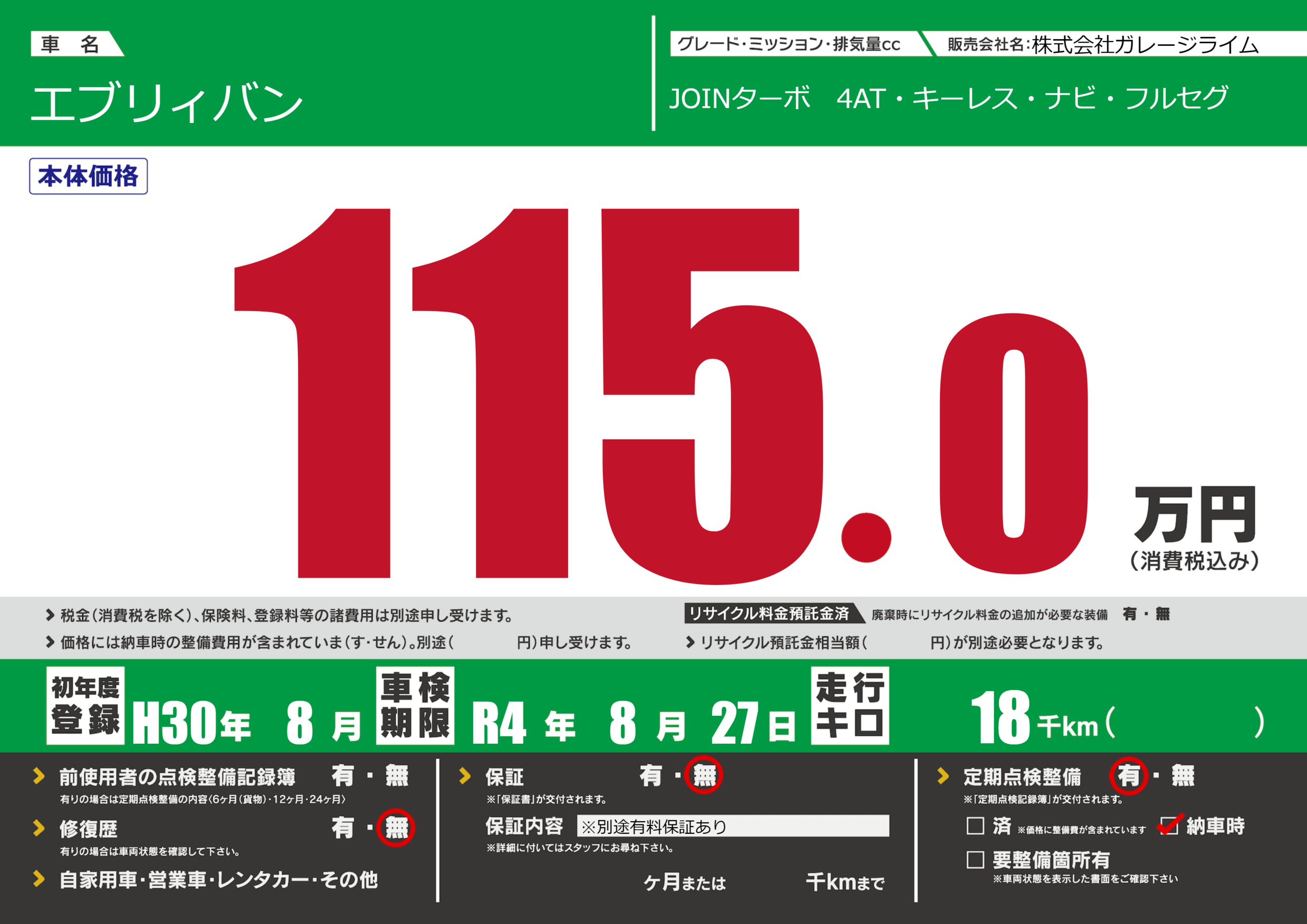 | 車名 | エブリィバン | グレード ミッション 排気量 |