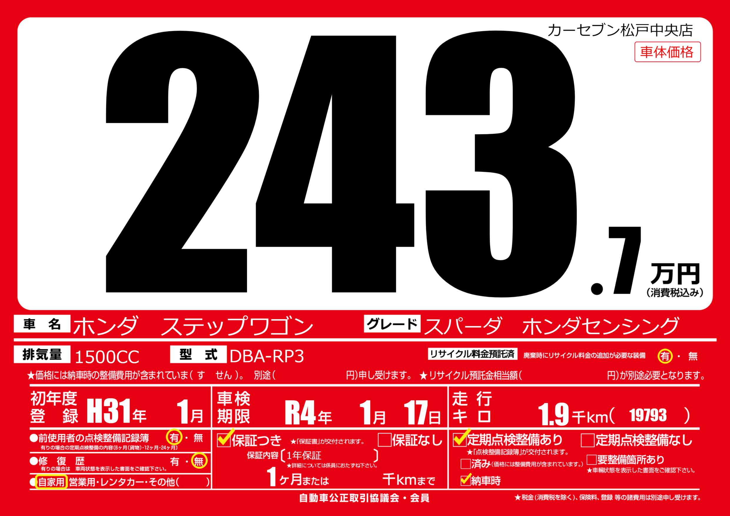 | 車名 | ホンダ ステップワゴン | グレード ミッション 排気量 |