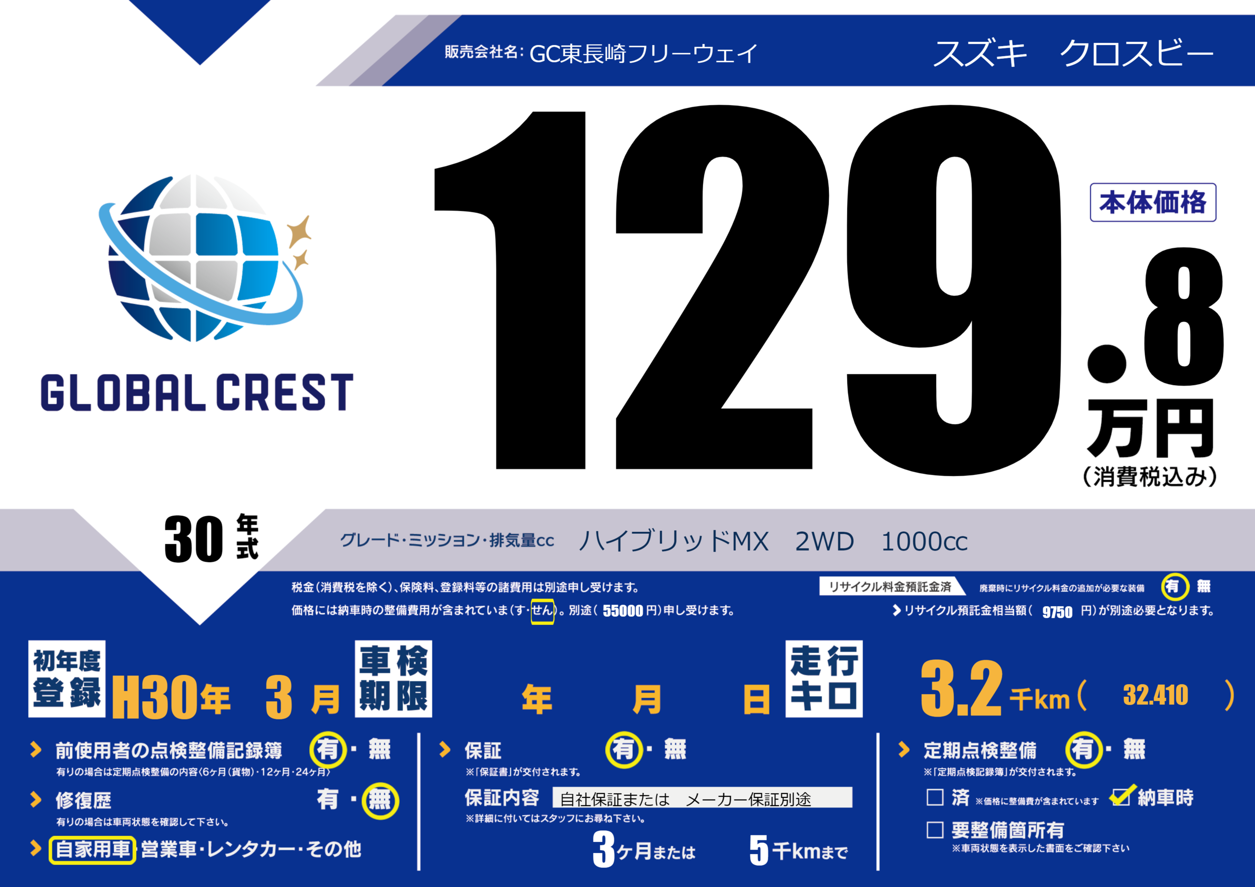 | 車名 | スズキ クロスビー | グレード ミッション 排気量 |