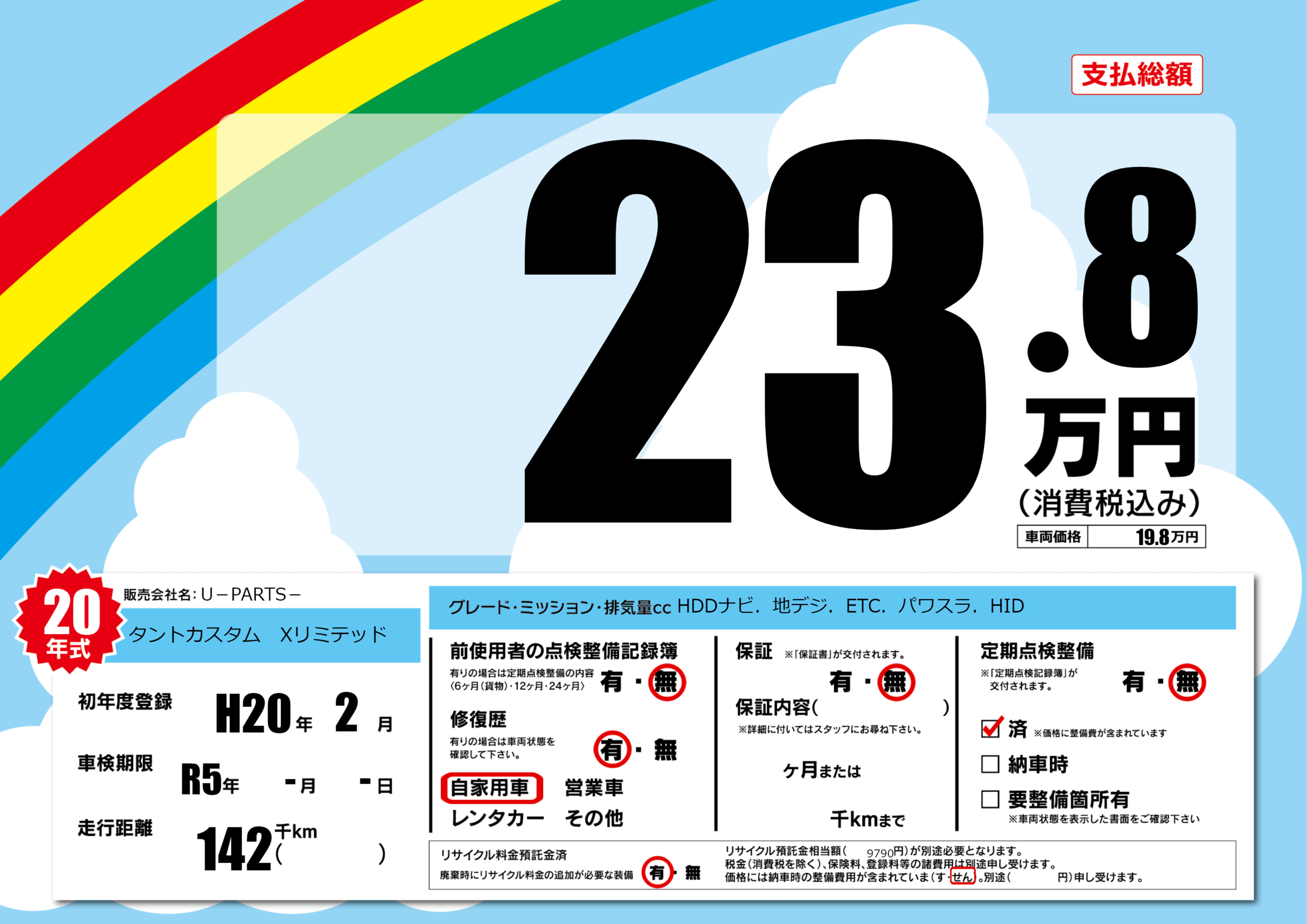 | 走行キロ | 14.2万km | 初年度登録 | H20年2月 |
