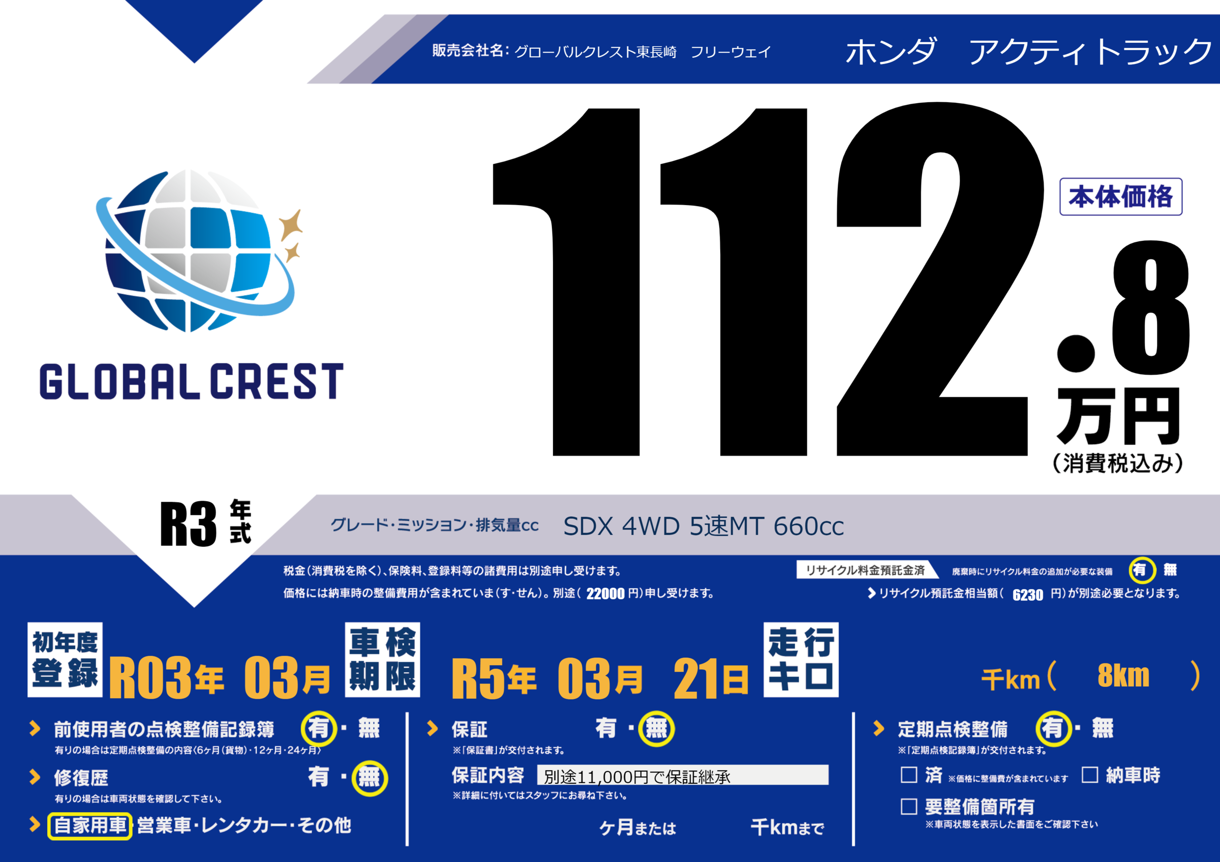 | 走行キロ | - | 初年度登録 | R03年03月 |