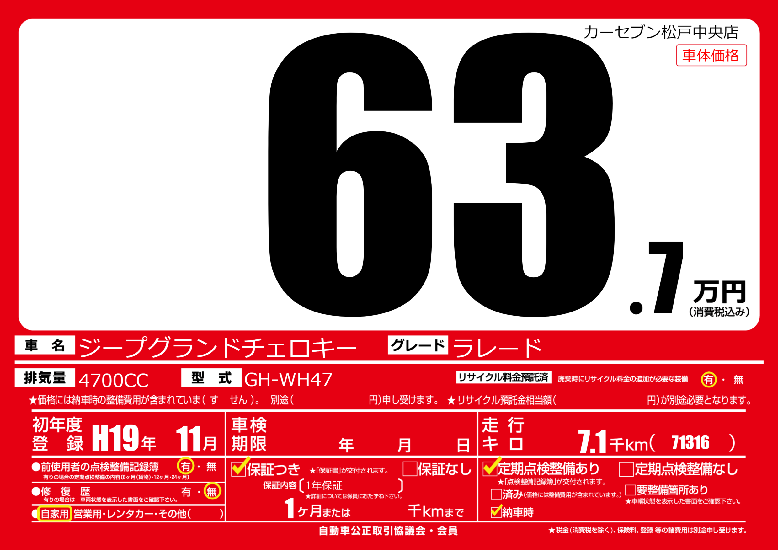 | 車名 | ジープグランドチェロキー | グレード ミッション 排気量 |