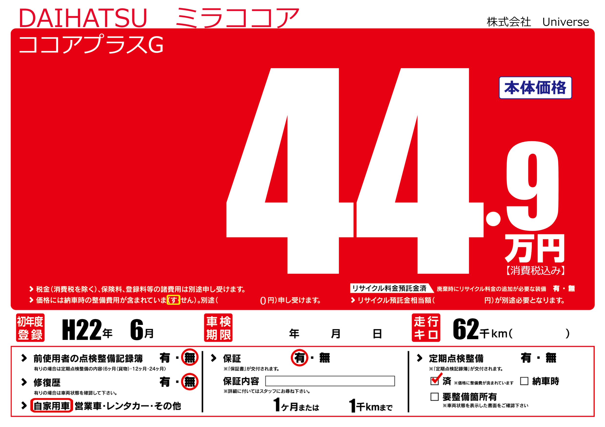 | 走行キロ | 6.2万km | 初年度登録 | H22年6月 |