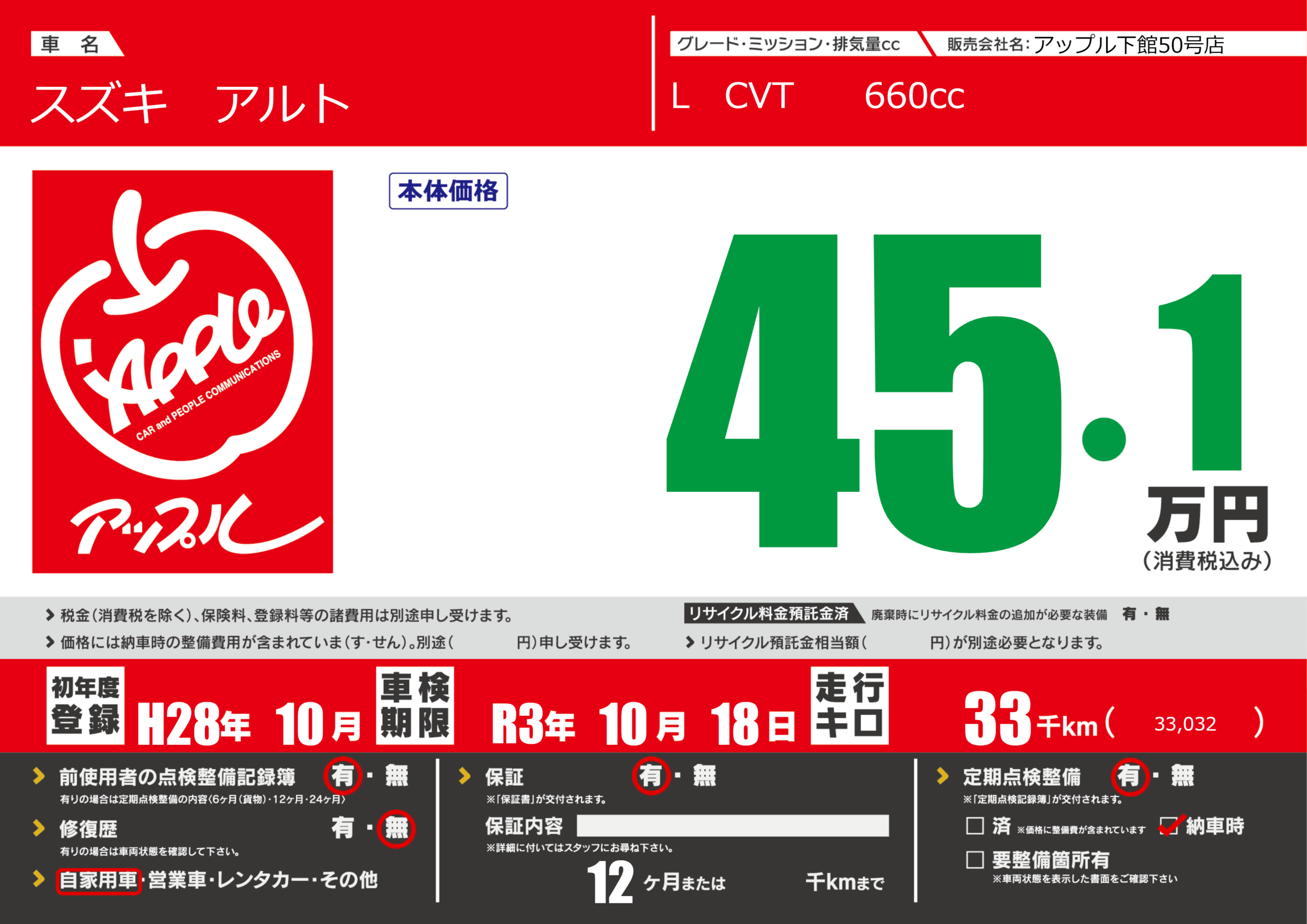 | 車名 | スズキ アルト | グレード ミッション 排気量 |