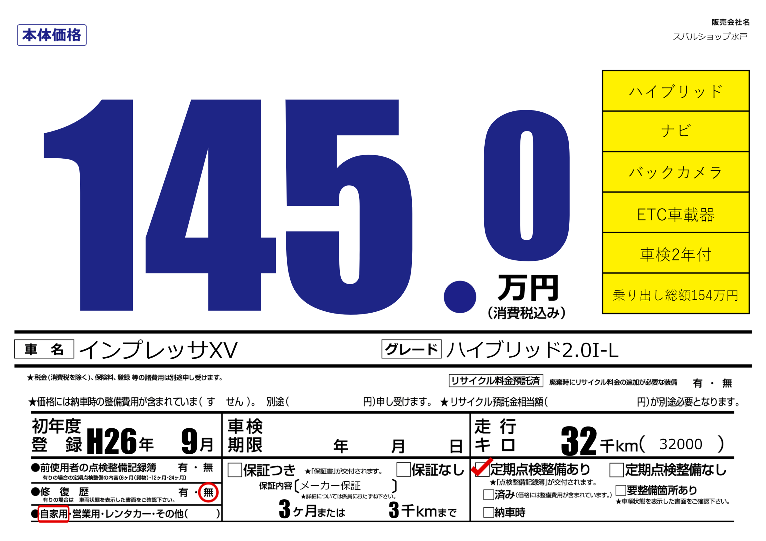 | 走行キロ | 3.2万km | 初年度登録 | H26年9月 |